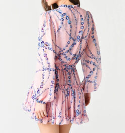 Misa Los Angeles Lorena Pink Floral Chiffon Long Sleeve V-Neck Mini Dress Med