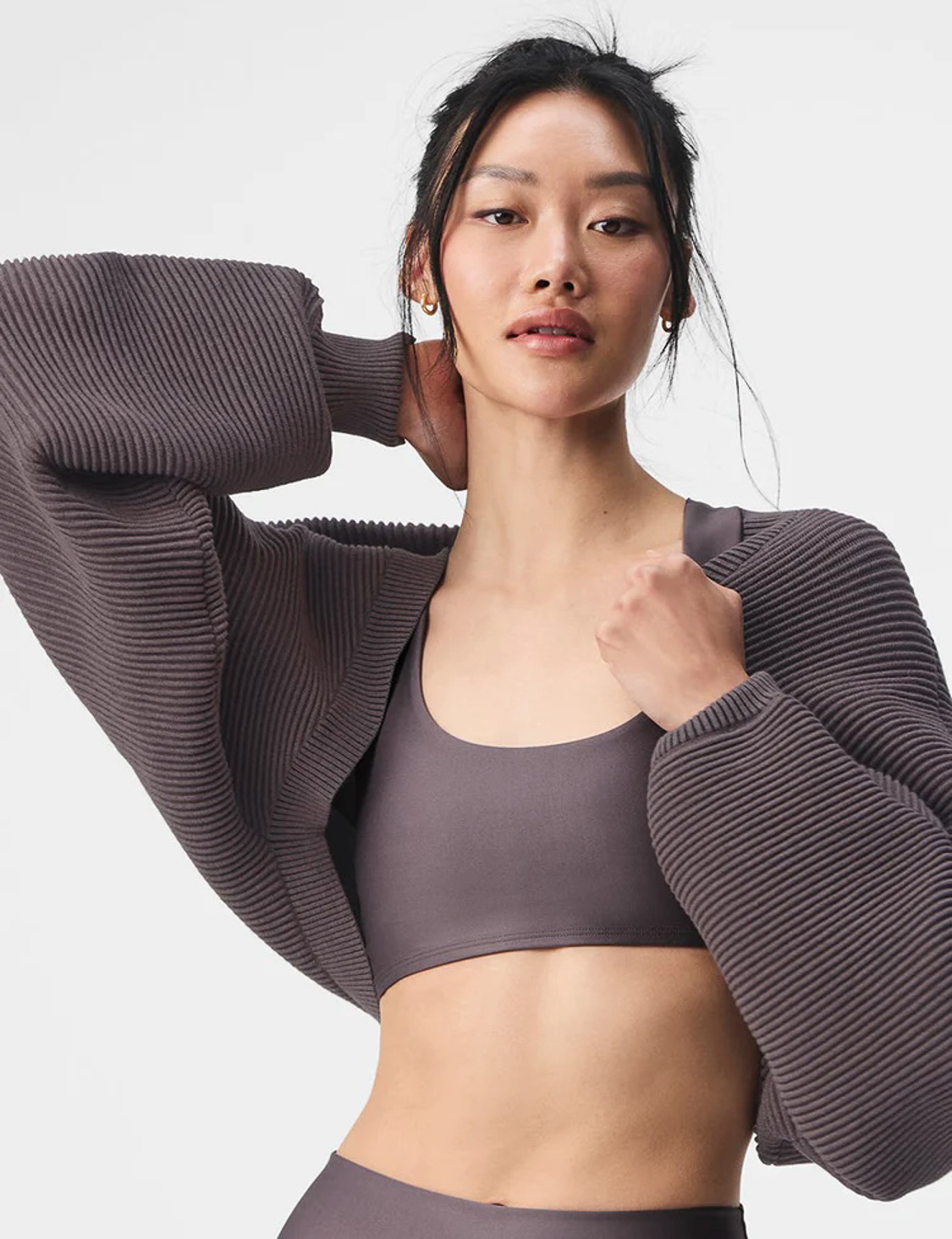 - Style: Denim Knit Shawl Raisinette Brown Ribbed Crop Sweater