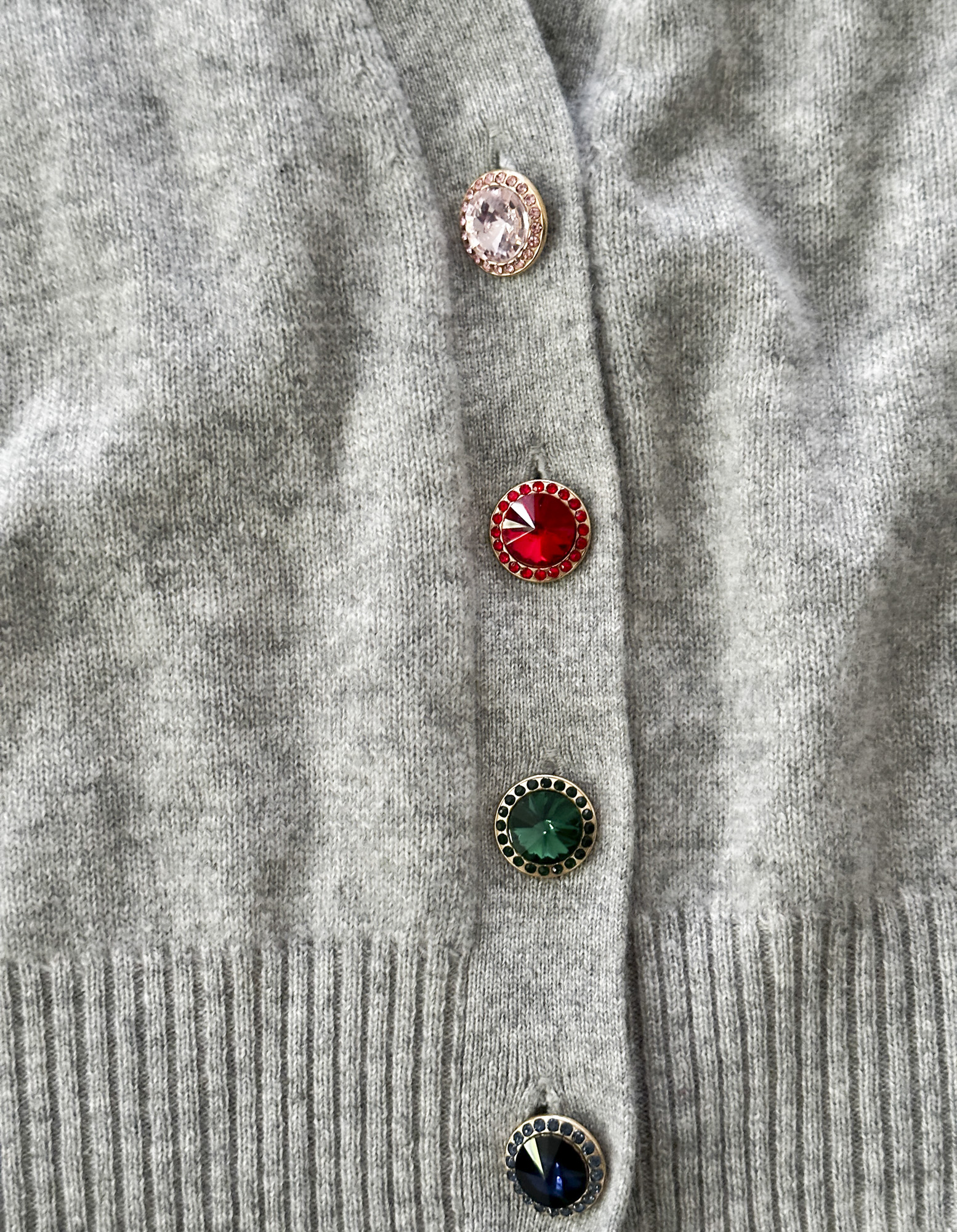 - Style: Gray 100% Cashmere Jewel Button V-Neck Cardigan Sweater