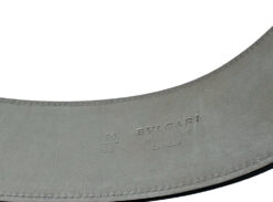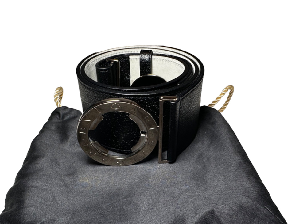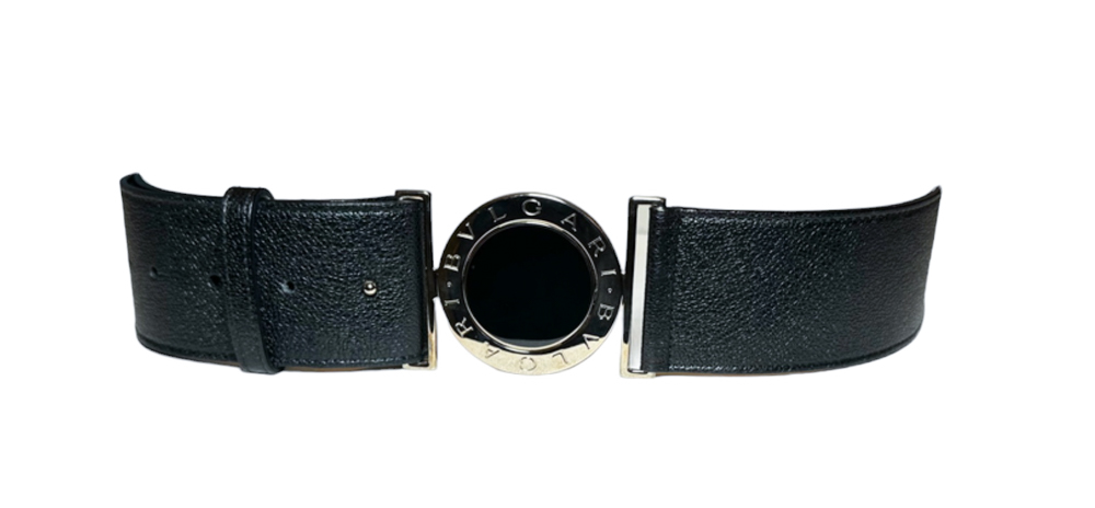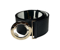- Style: Black Grained Leather Silver Tone Logo Buckle Wide Belt