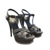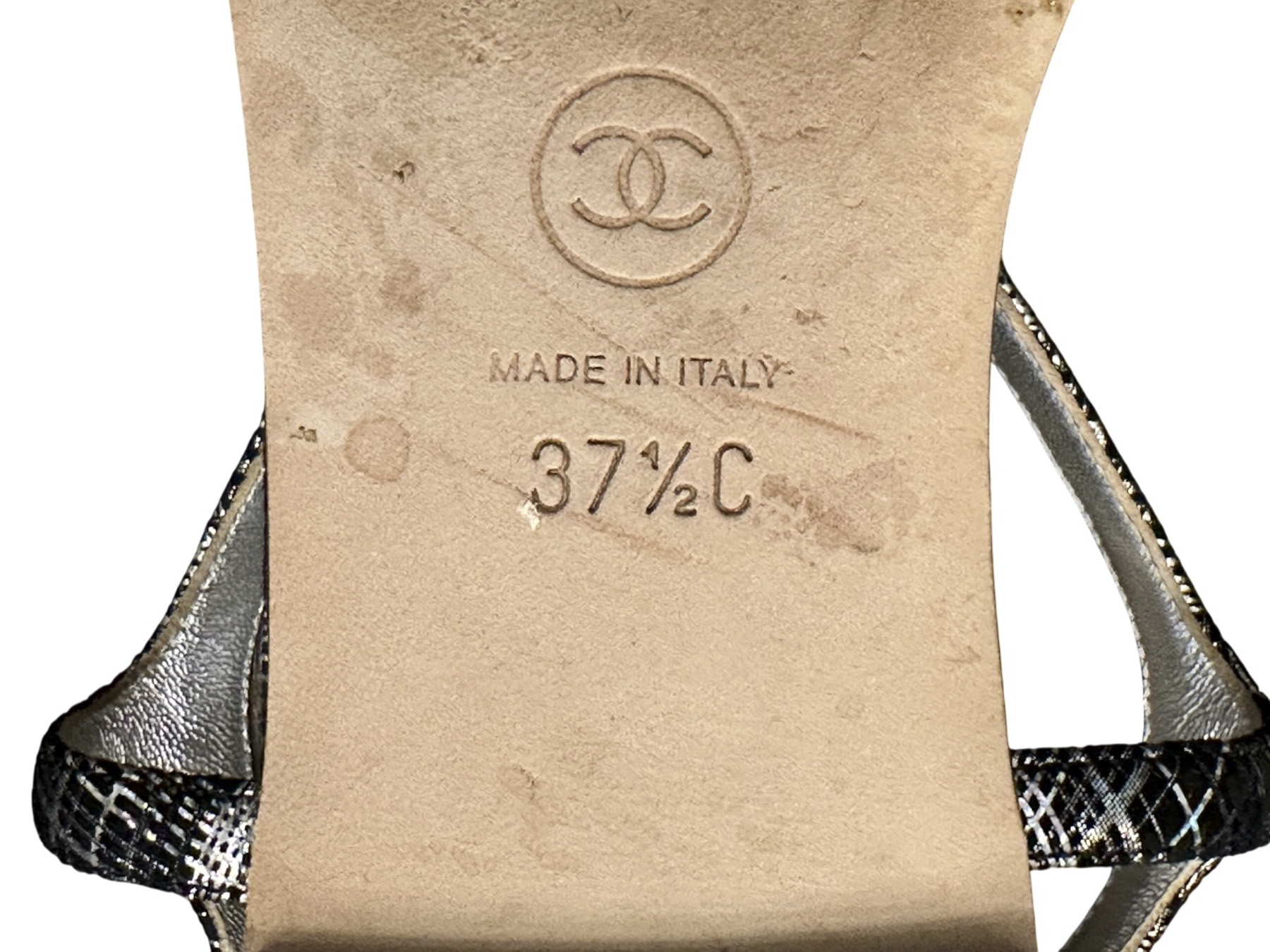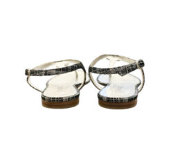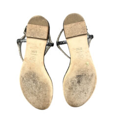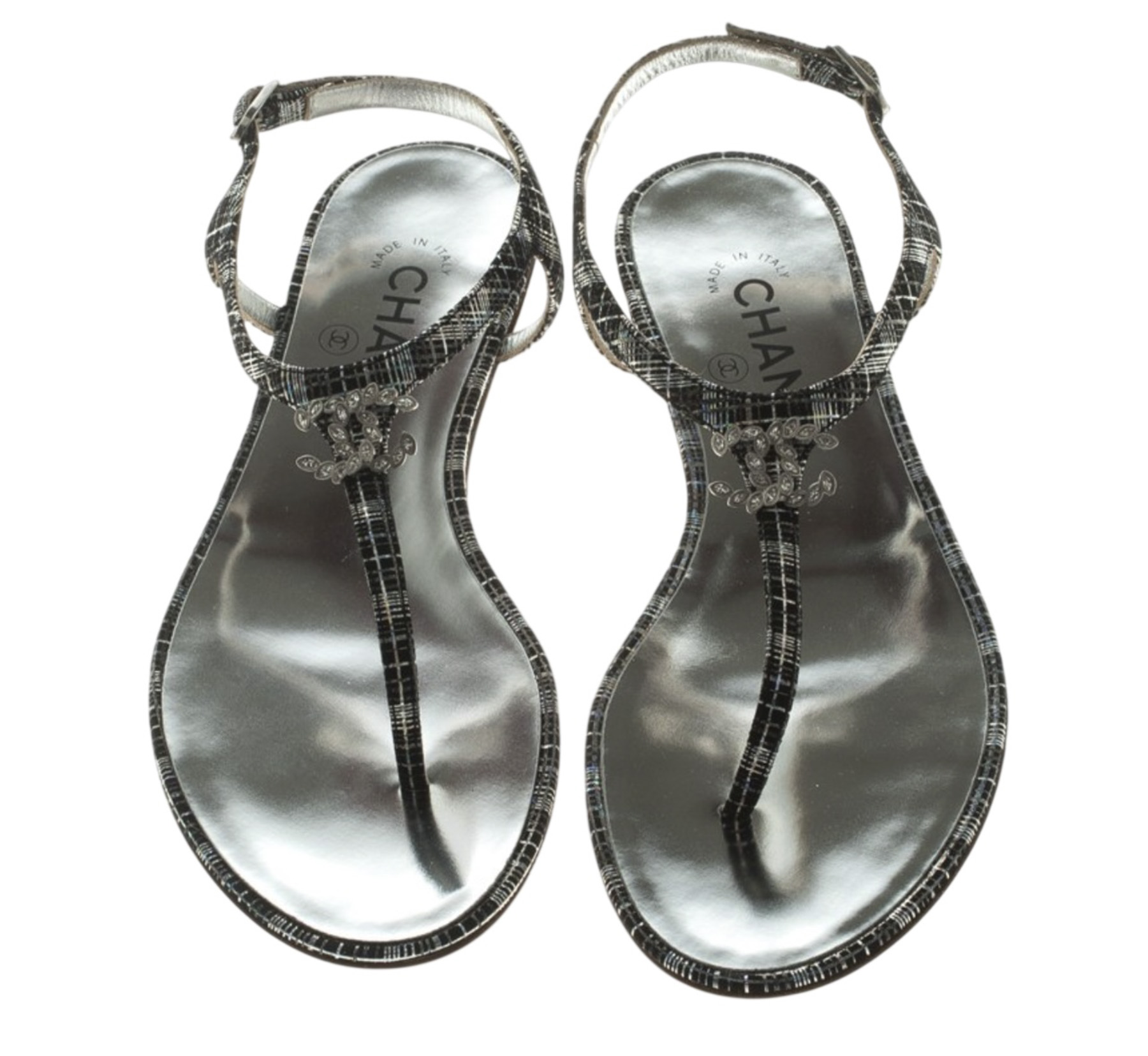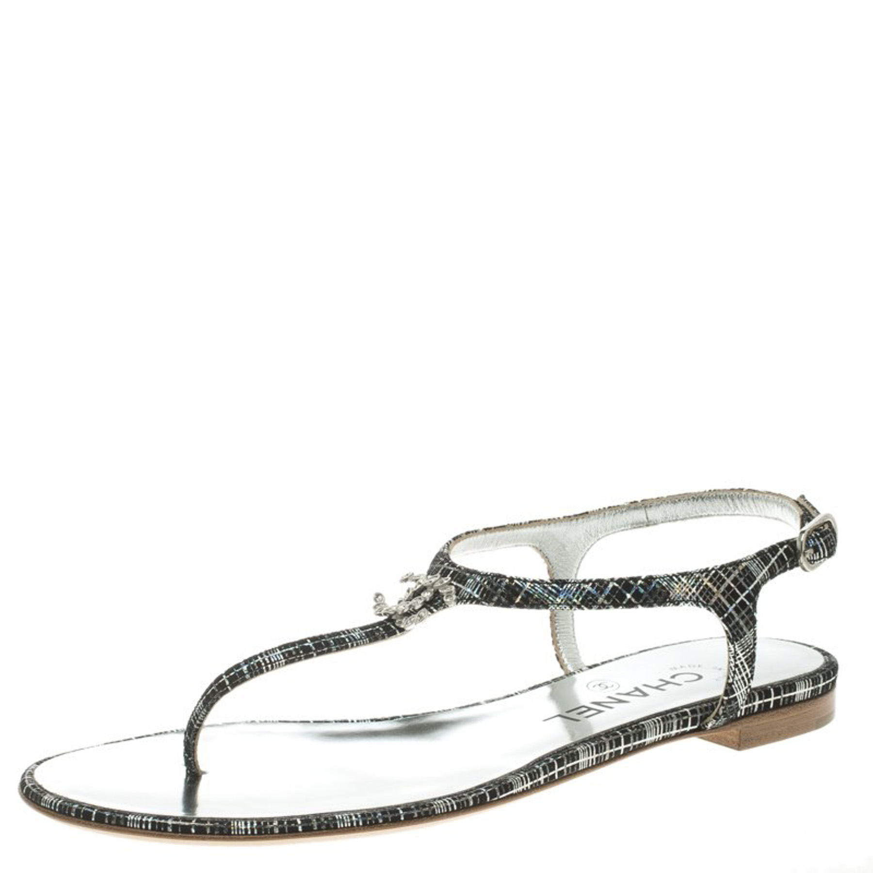 - Style: Black Metallic Tweed Crystal CC Ankle T-Strap Thong Flat Sandals
