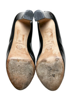 • Style: Black Patent Cap Toe Logo Plate Heels Pumps