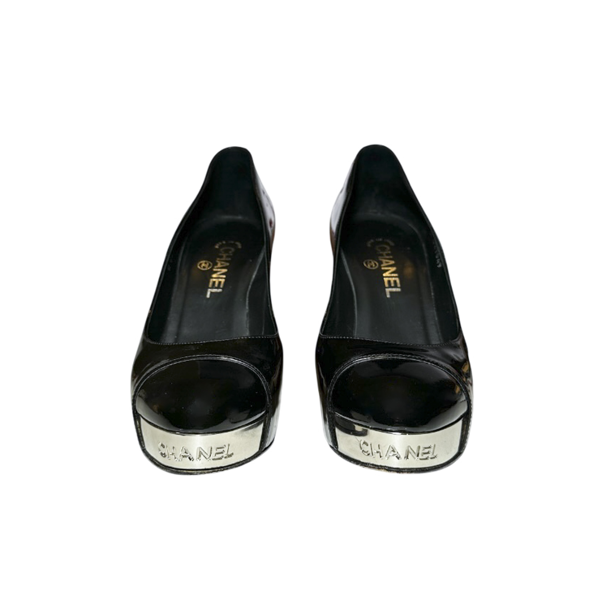Chanel Black Patent Cap Toe Logo Plate Platform Heels Pumps Size 39