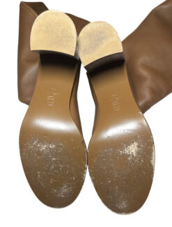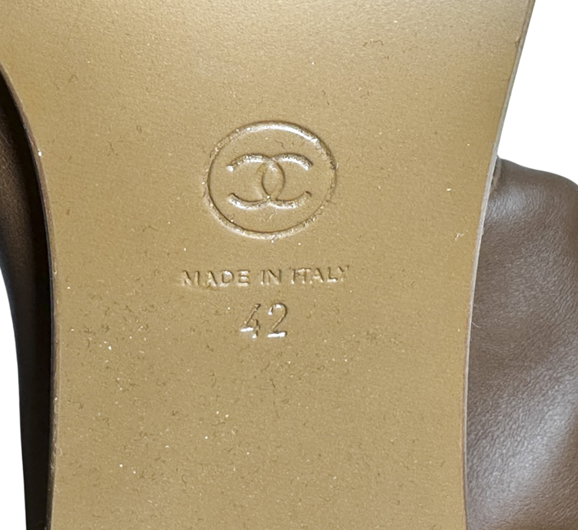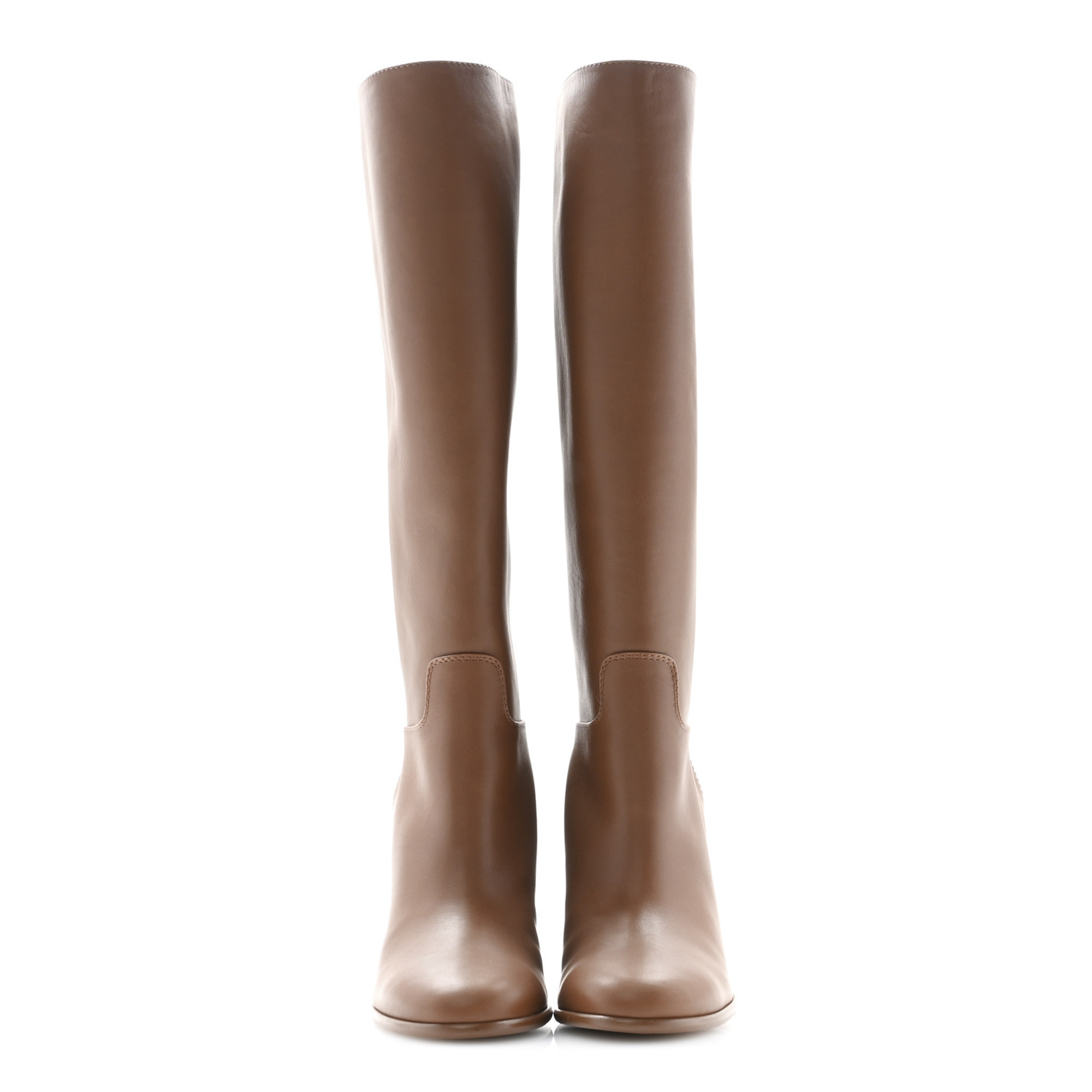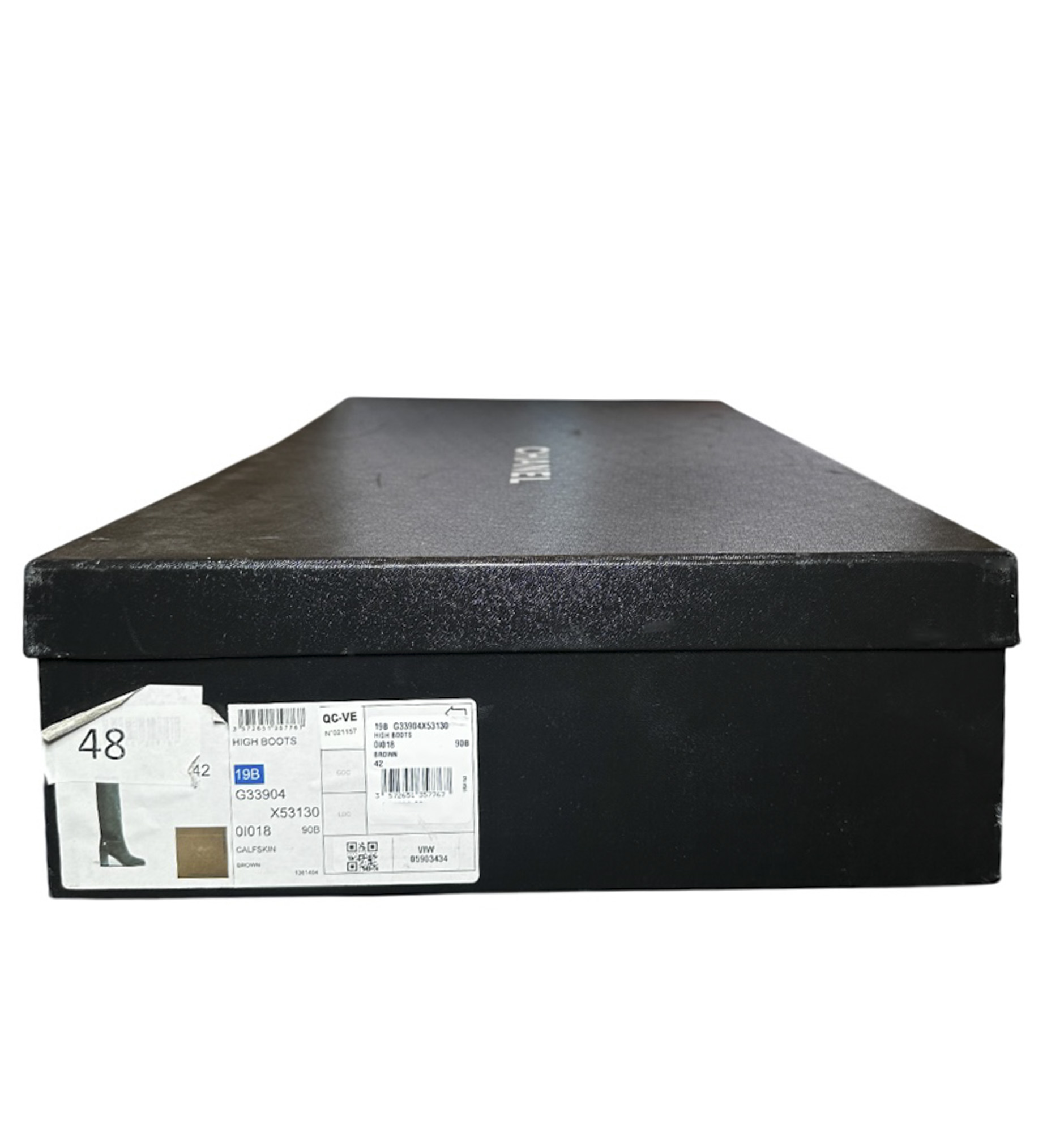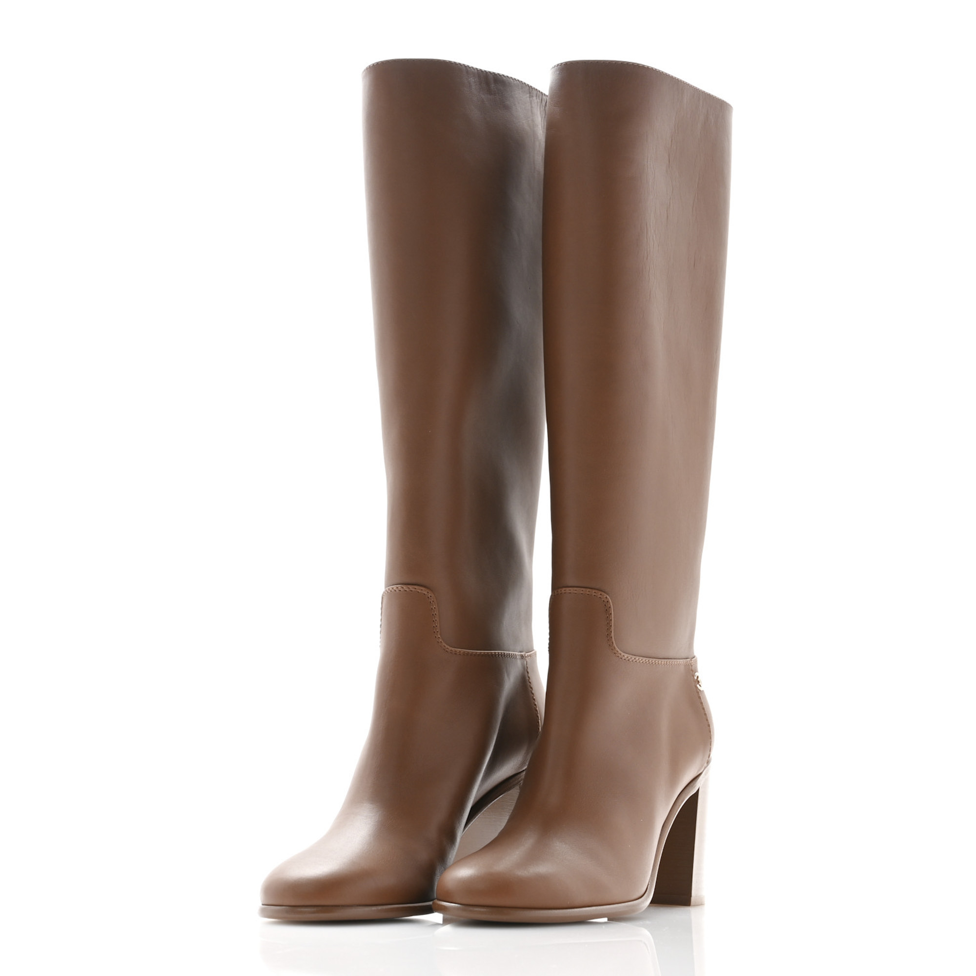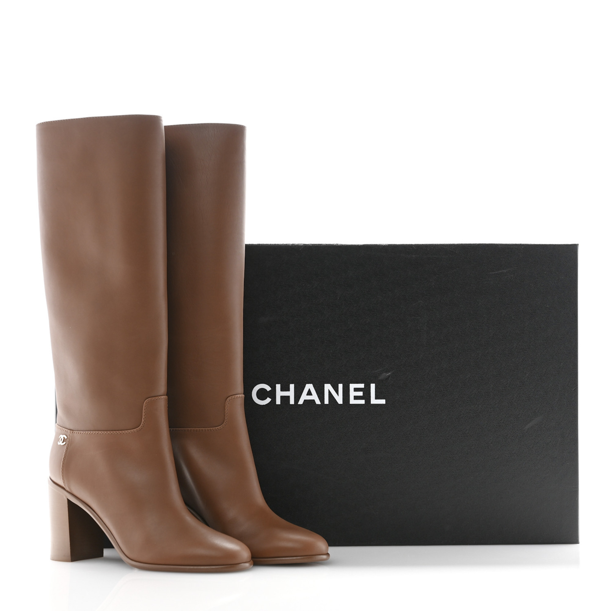 - Style: Brown Calfskin CC Logo Pull On Tall Heels Boots