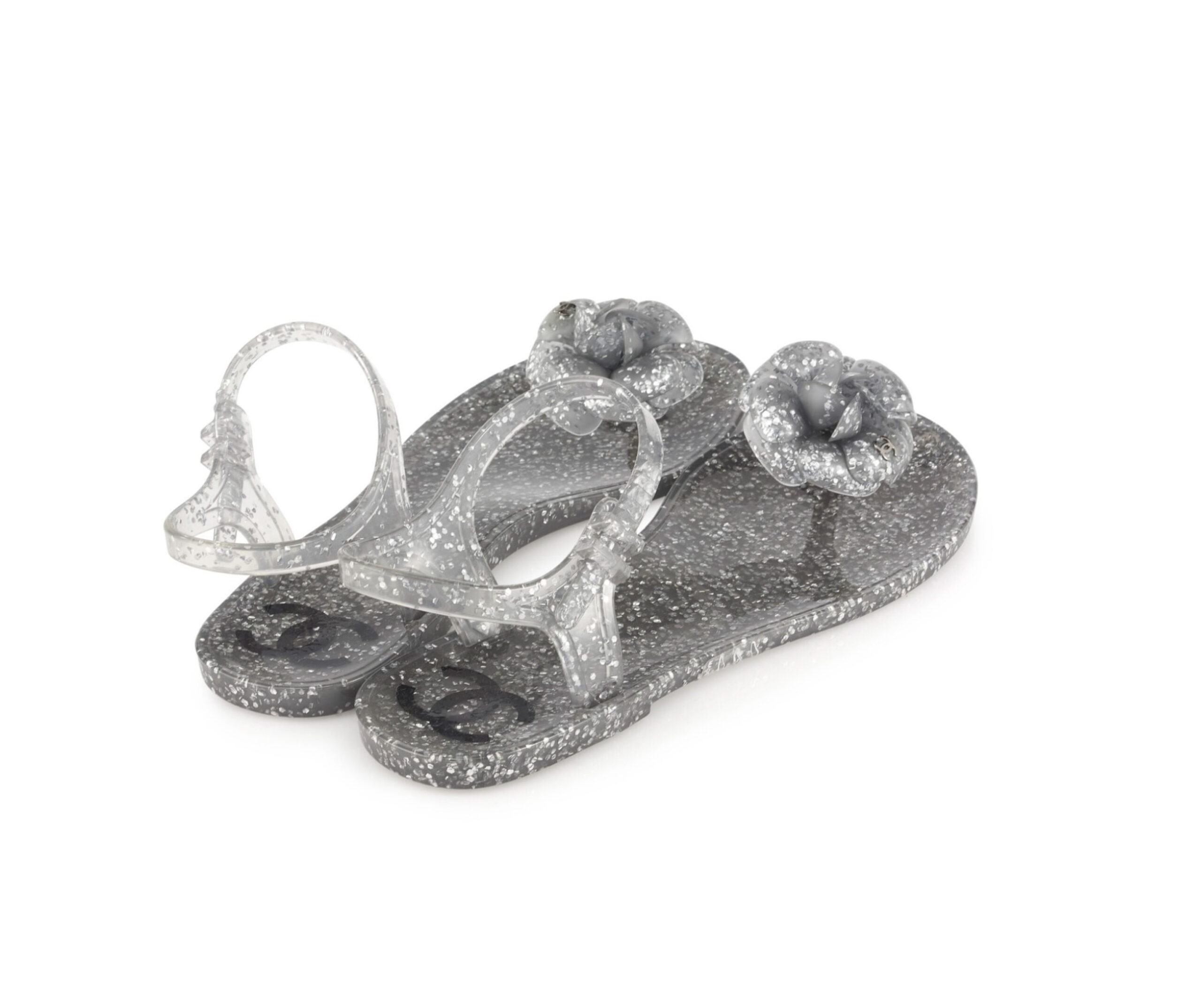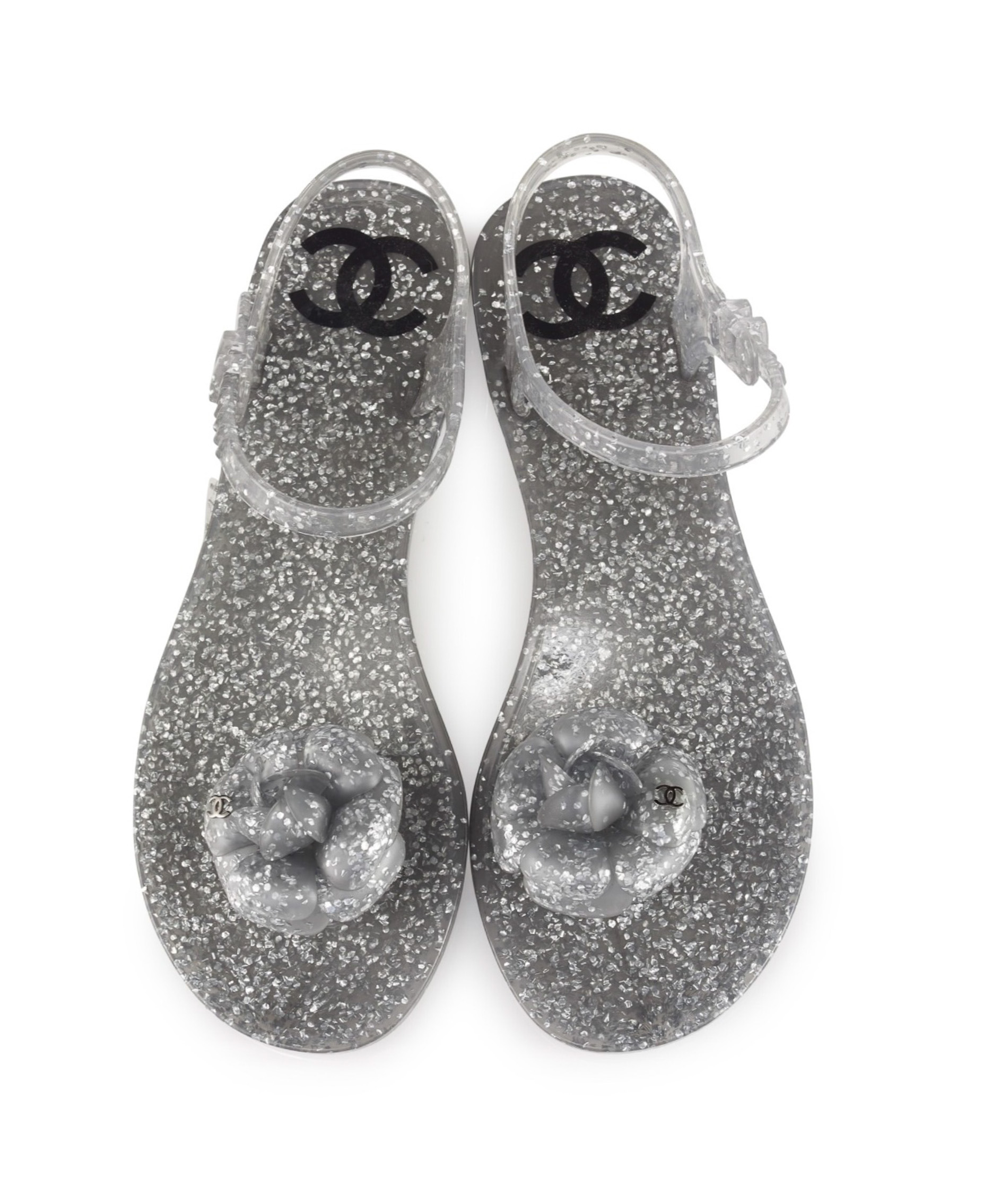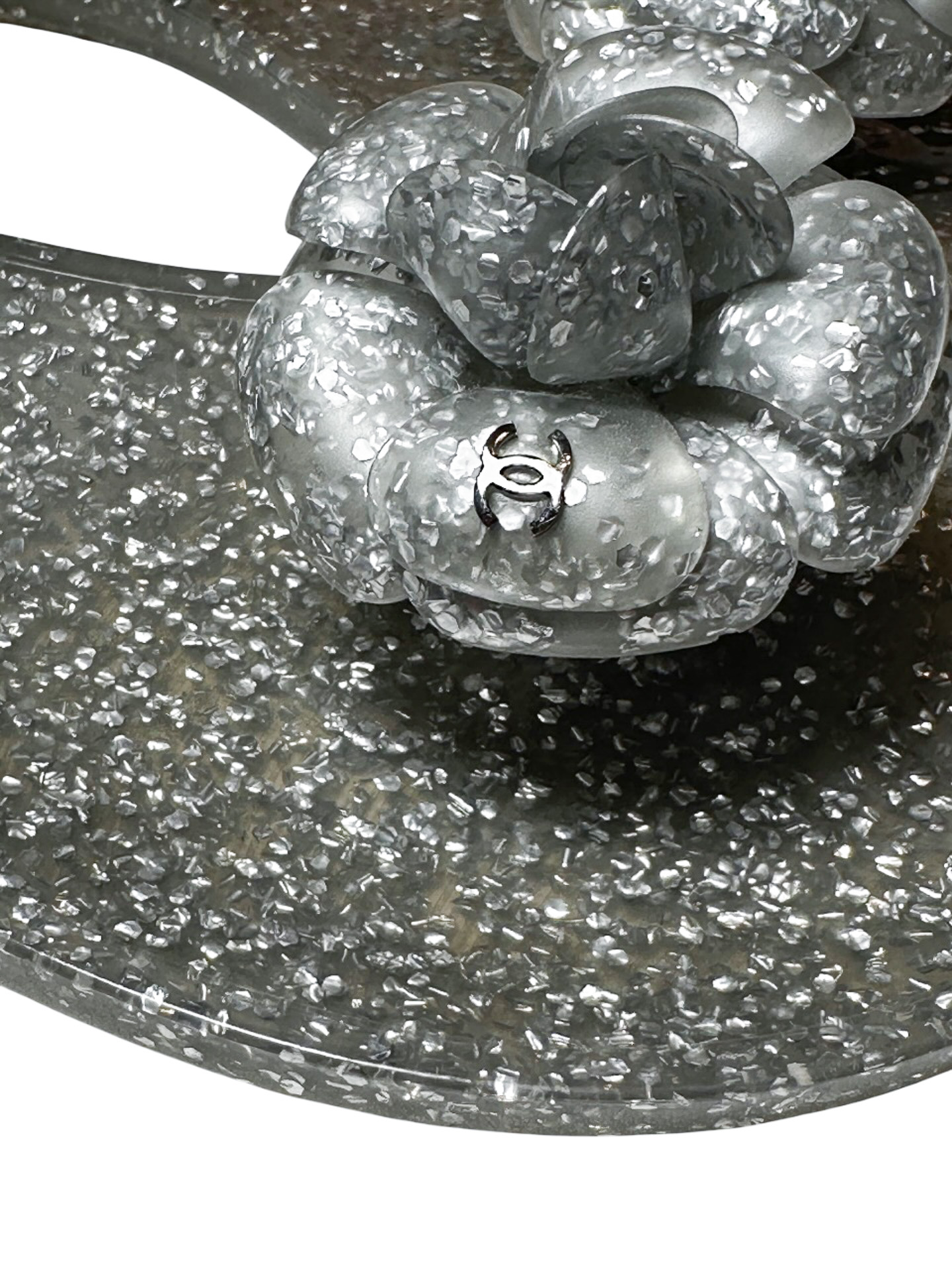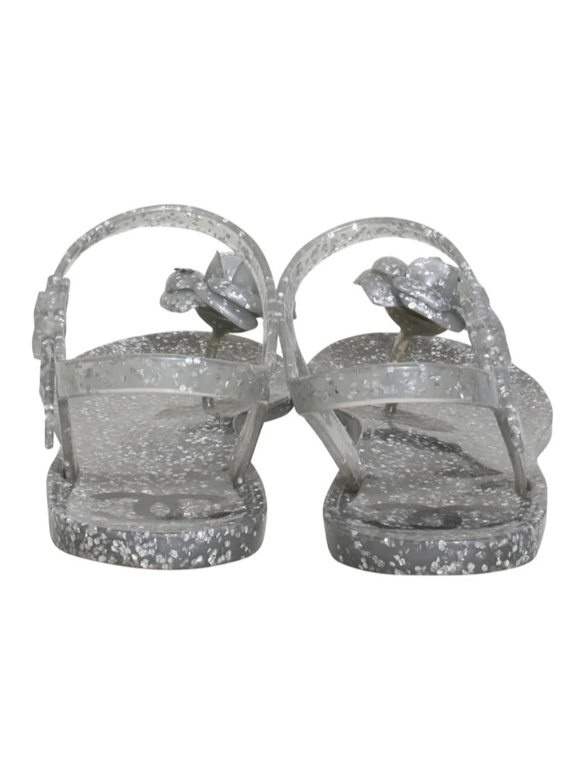 Chanel Camellia Flower Silver Glitter Thong Ankle Strap Jelly Sandals Size 39