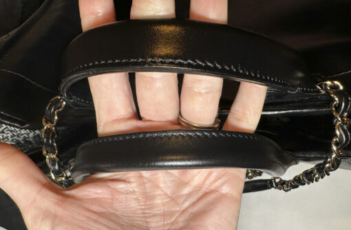 - There is a very small scuff to the leather on rear of bag; it is very hard to see and we had to angle the bag & shine the light in order to photograph (photo with arrow)