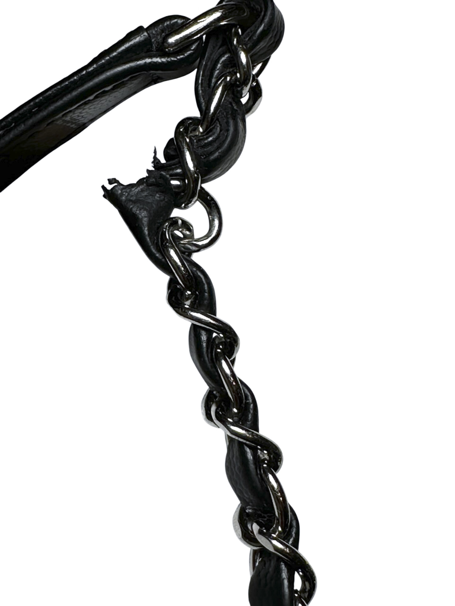• There is wear to the handles of the bag (see photos); Interior Lining has soiling.Chain has area where leather has popped through.