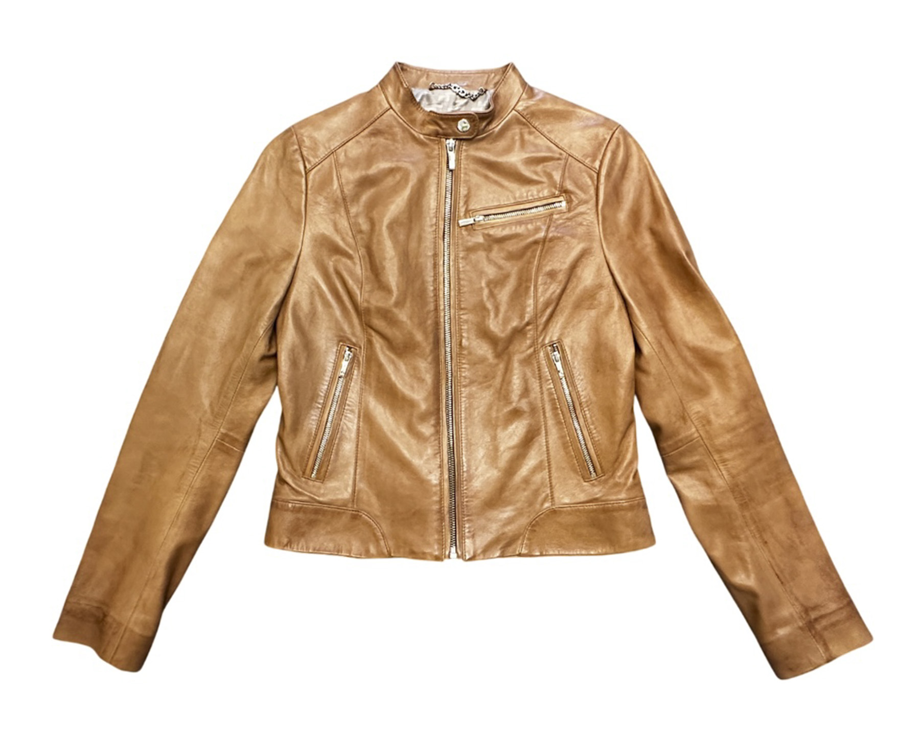 - Style: Tan Lambskin Leather Full Zip Biker Jacket