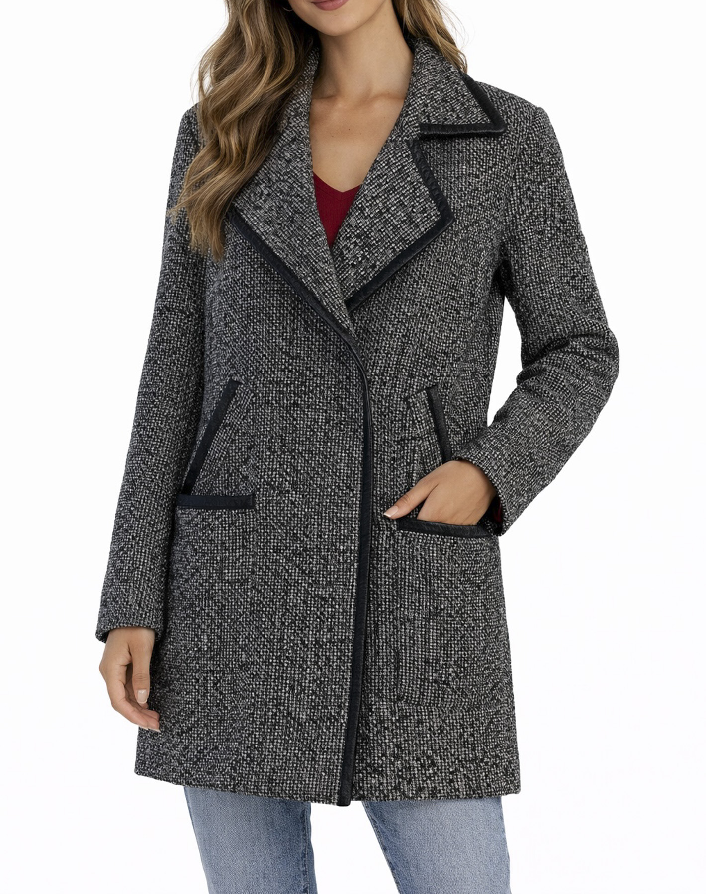 Cynthia Rowley Black White Tweed Leather Trim Long Coat Size 6