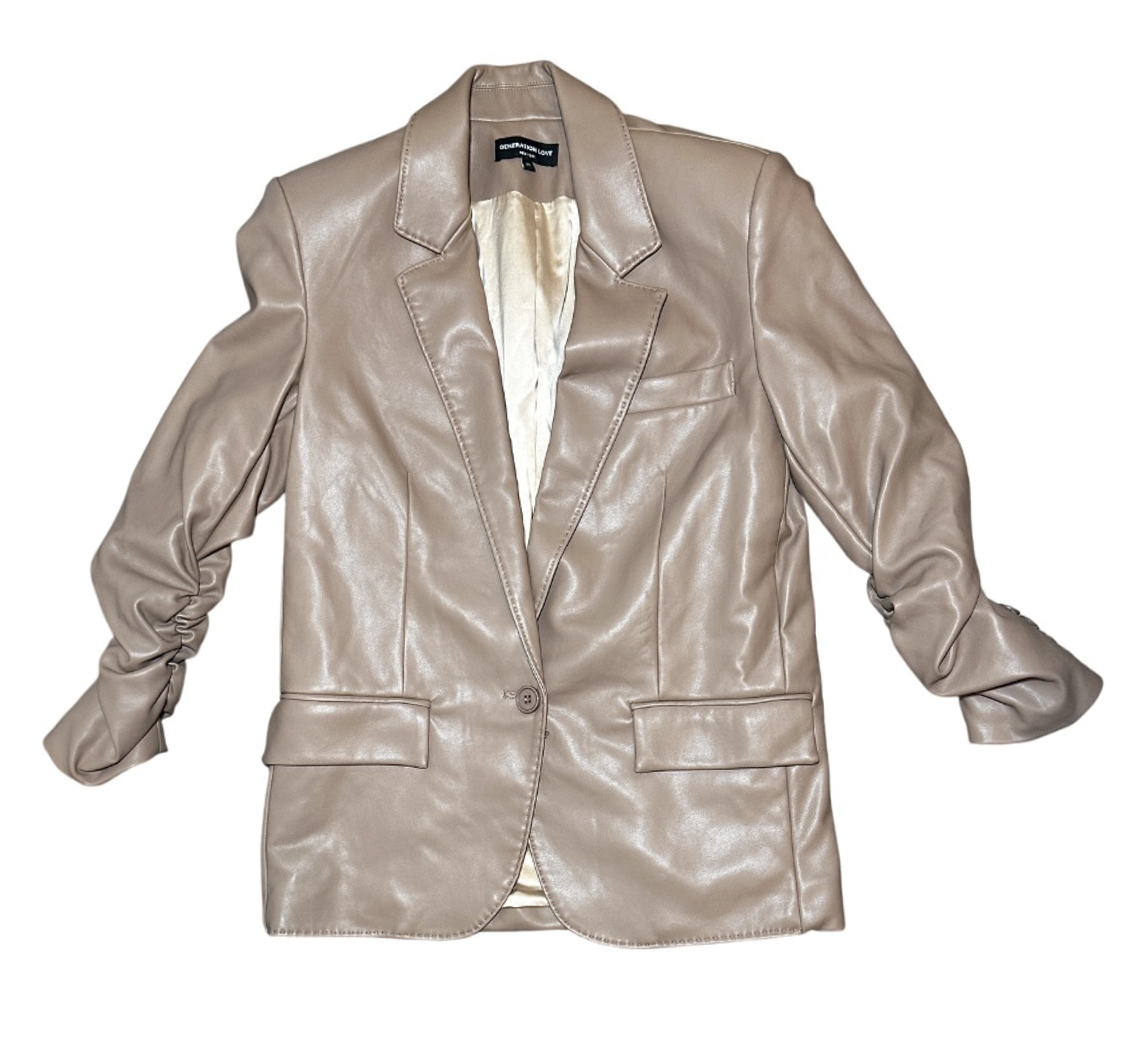 - Style: Millie Tan Vegan Leather Ruched Sleeve Jacket Blazer