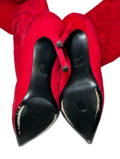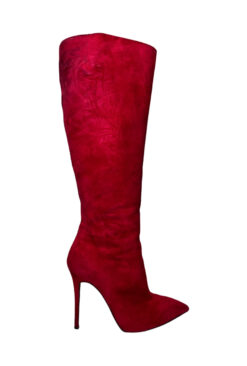 - Style: Yvette Red Suede Pointed Toe Knee High Stiletto Boots