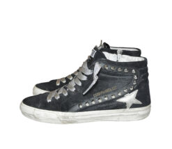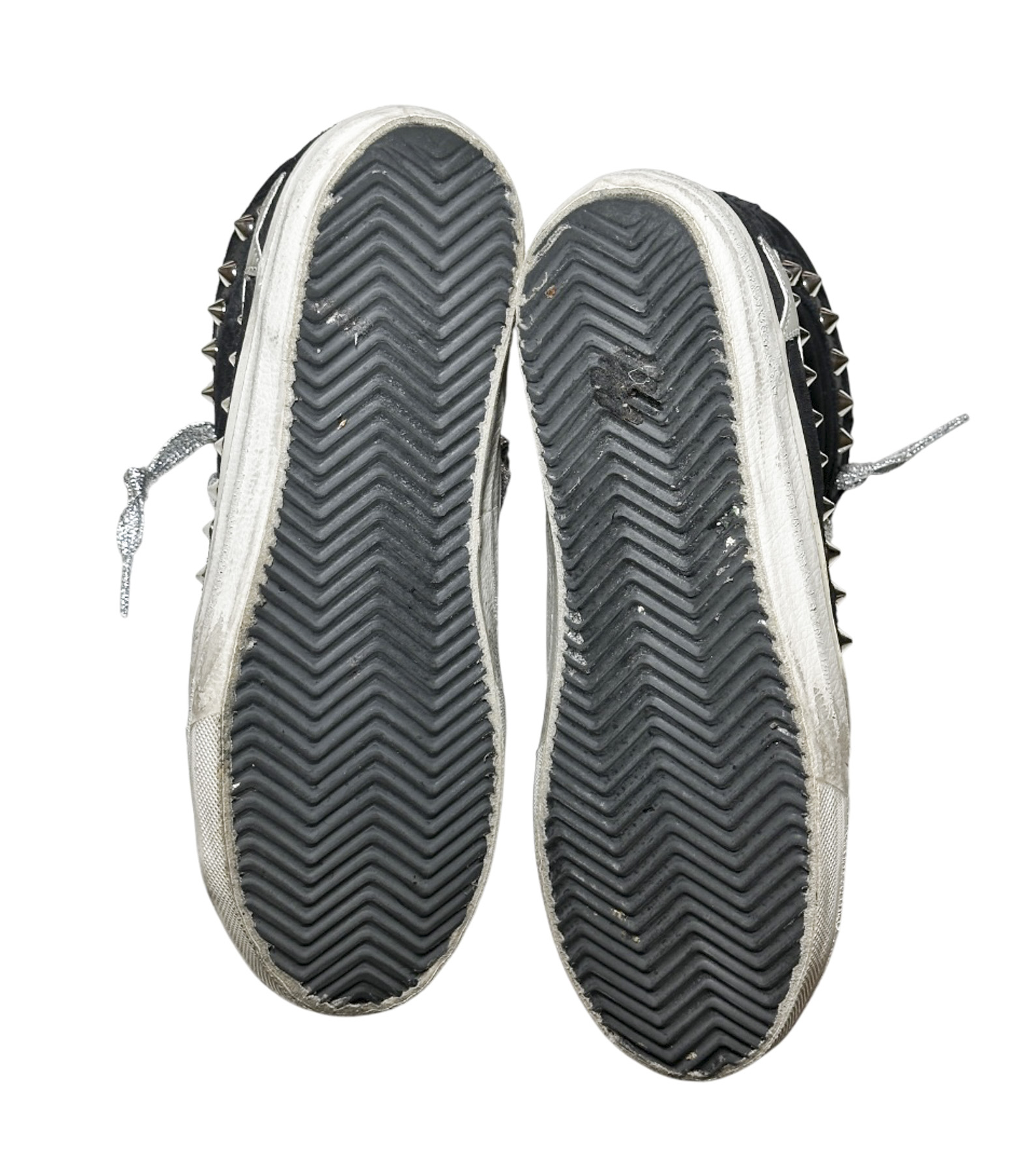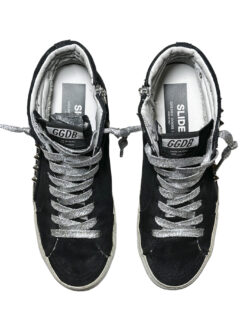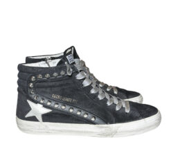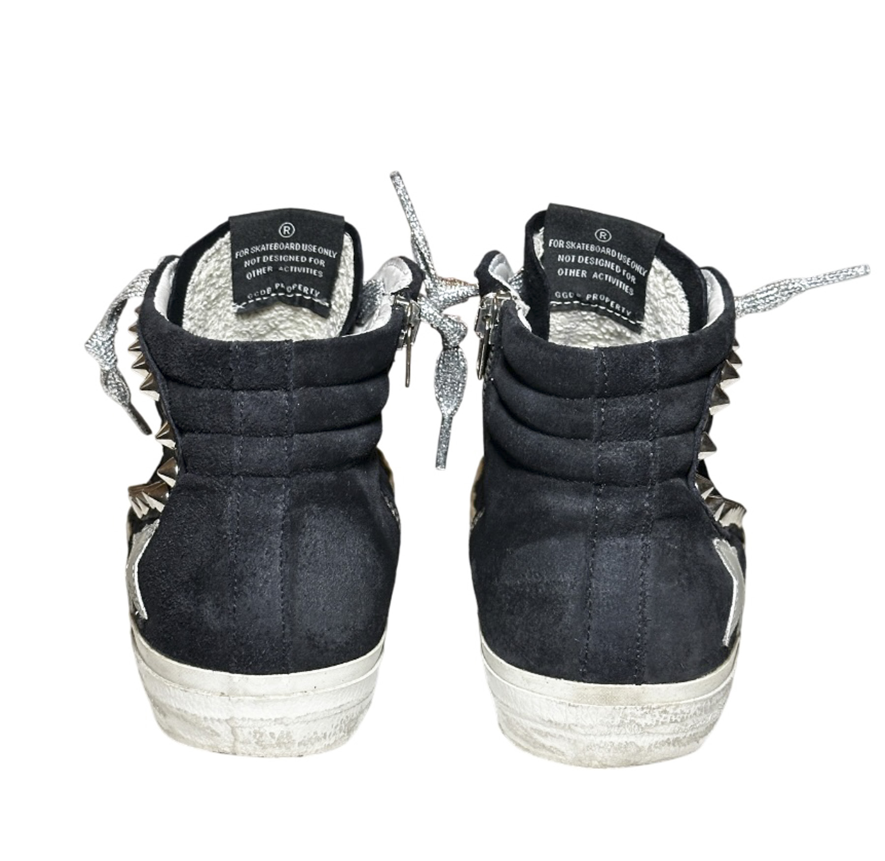 - Style: Private Edition Slide Black Suede Studded High Top Sneakers