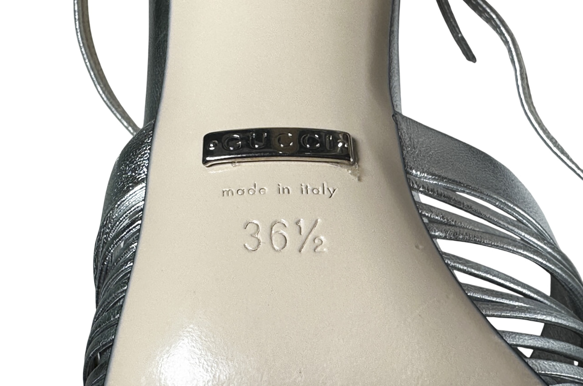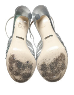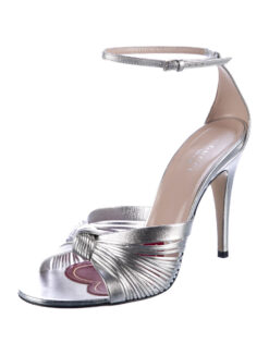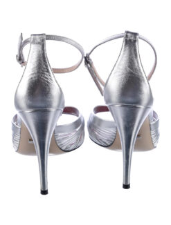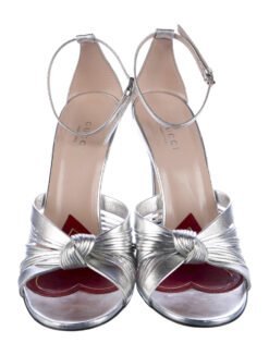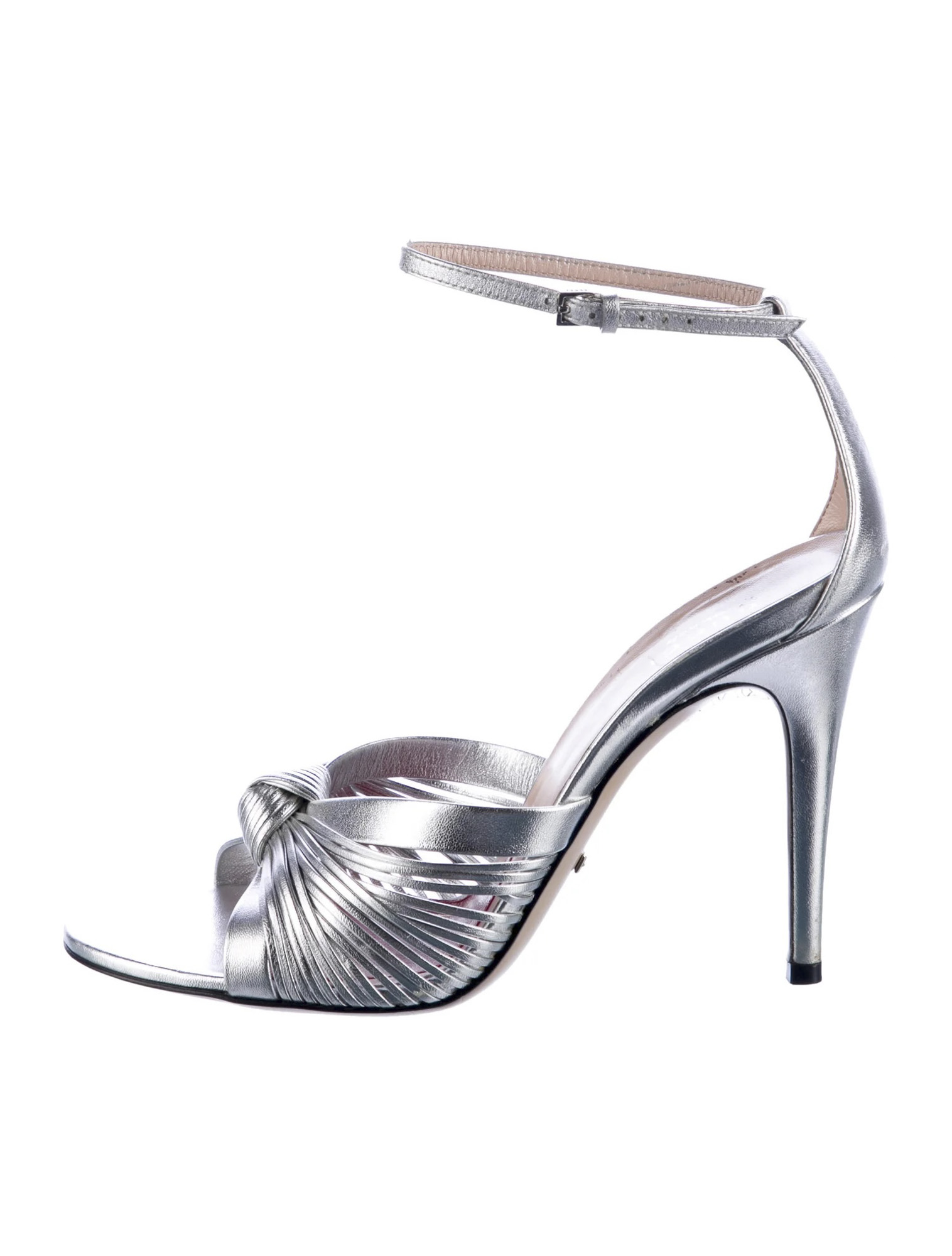 - Style: Allie Knot Silver Metallic Leather Ankle Strap Heels Sandals