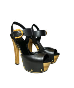 - Style: Black Leather Bamboo Buckle Ankle Strap Wooden Platform Heels Sandals
