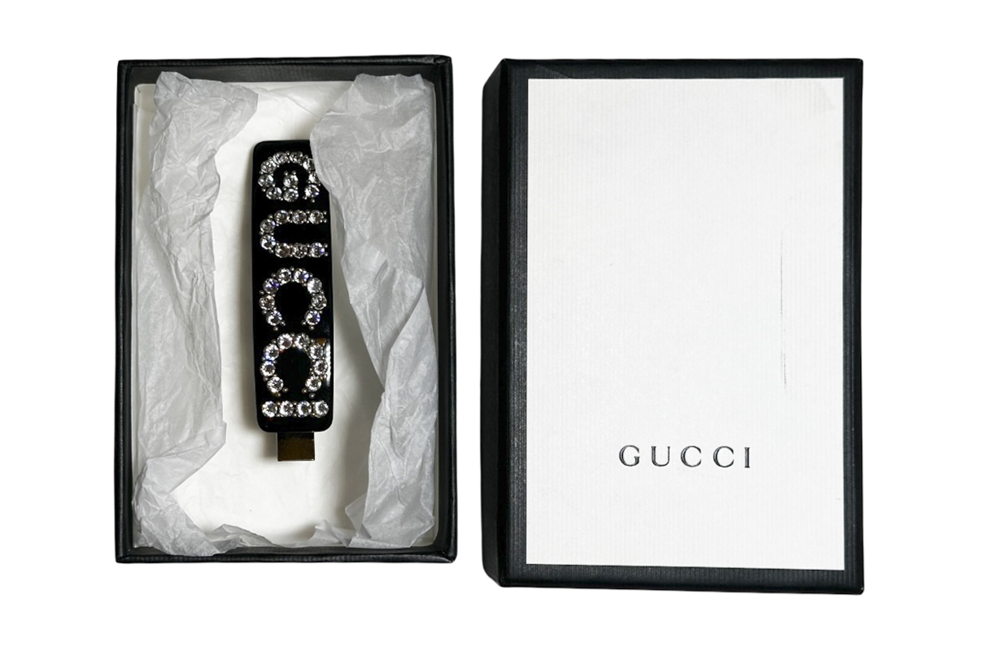 Gucci Black Resin Crystal Rhinestone Logo Single Hair Barrette Clip NEW BOX