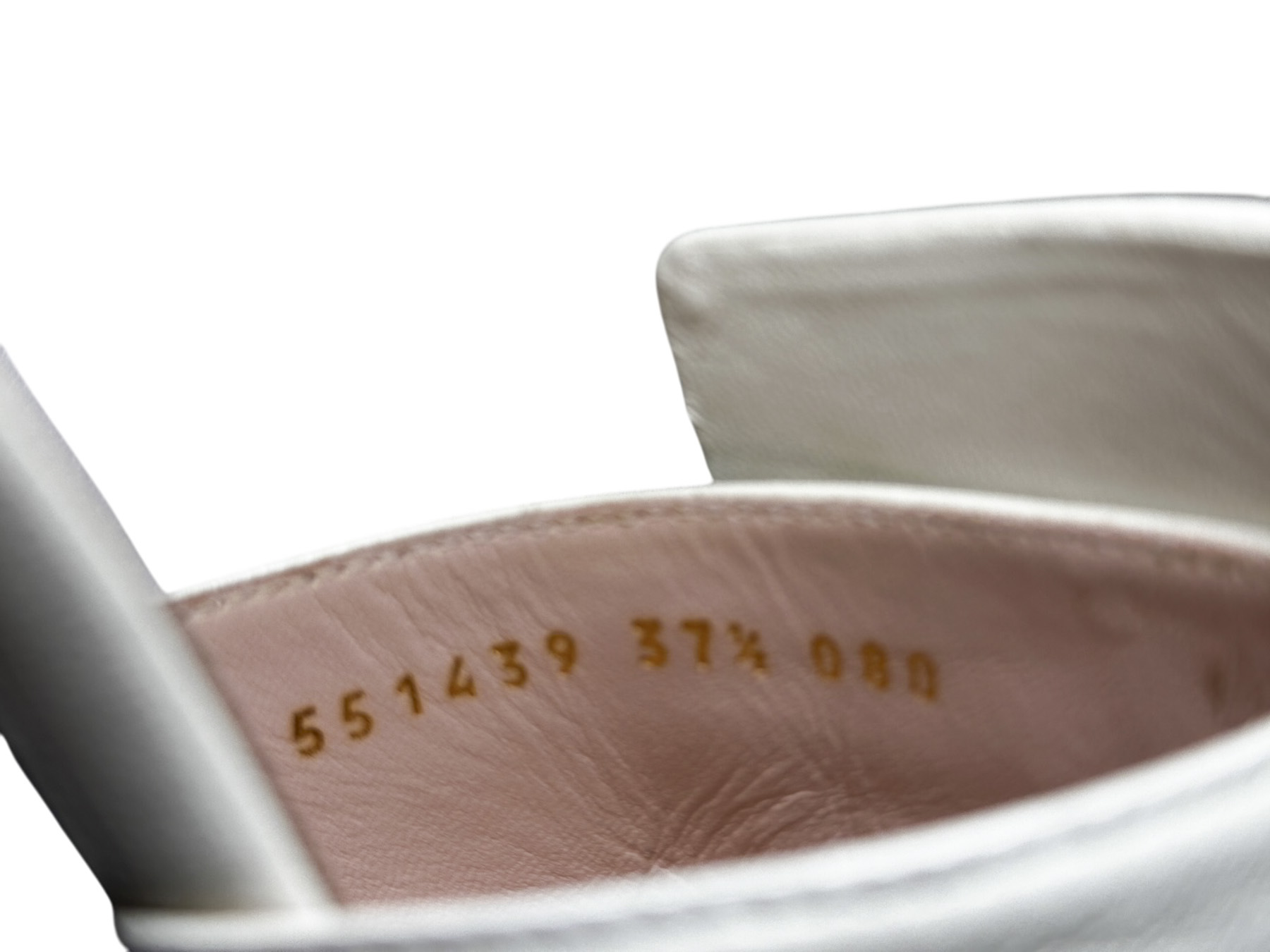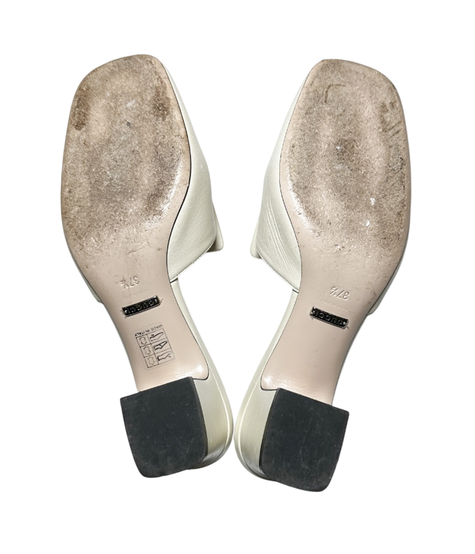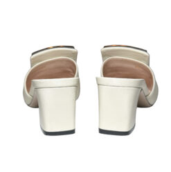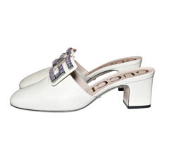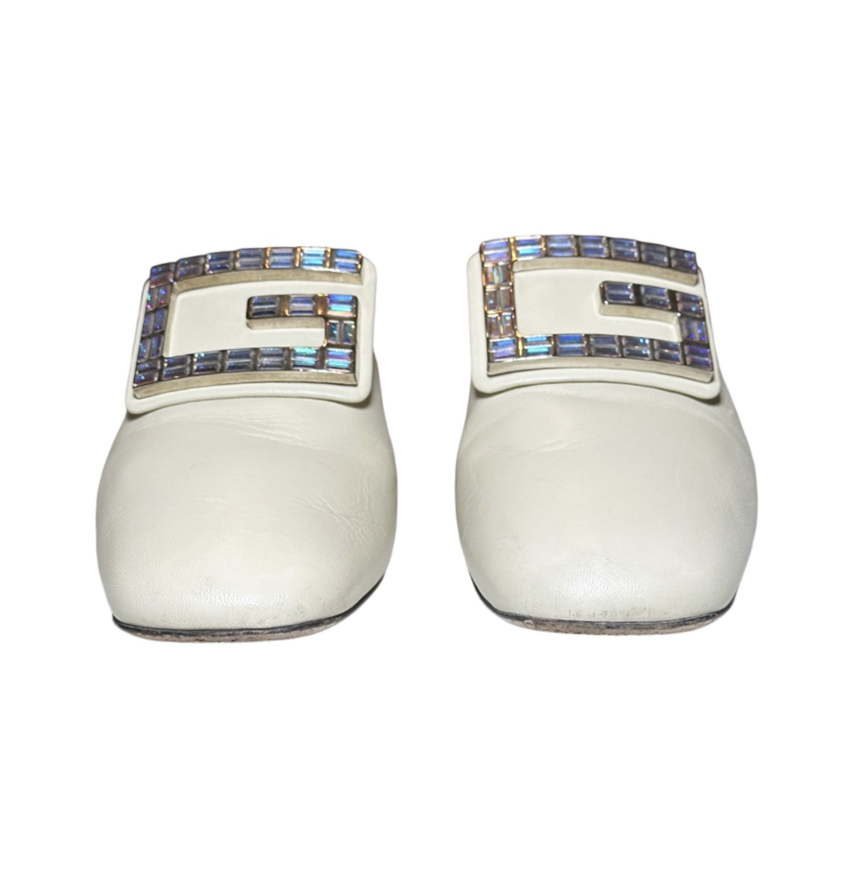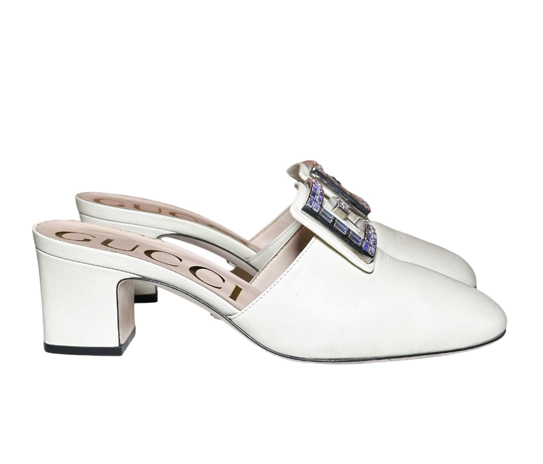 - Style: Madelyn Crystal Square G Logo Ivory Leather Mules Slides Heels