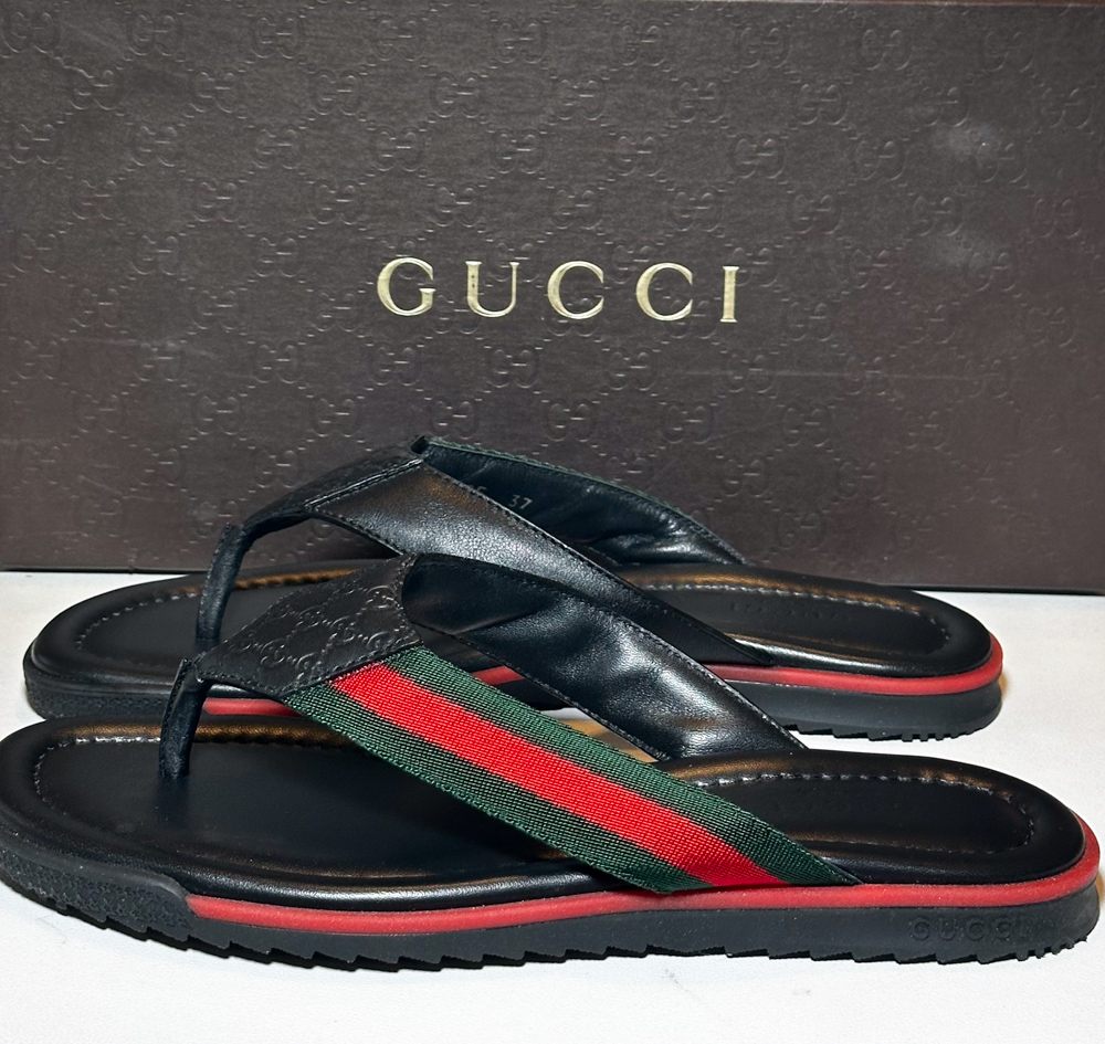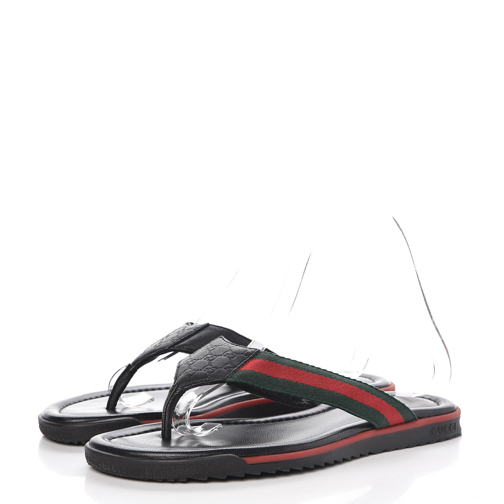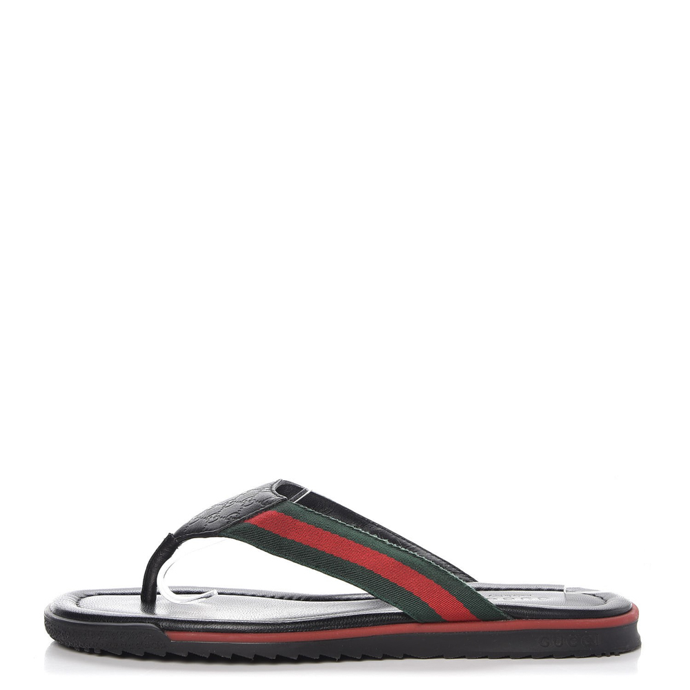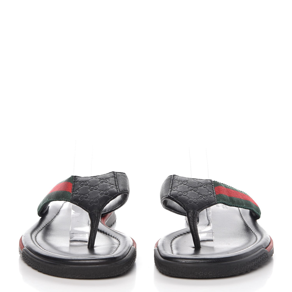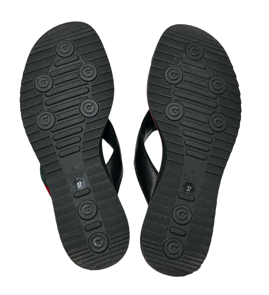 - Style: Black Leather Web Stripe Thong Flat Sandals