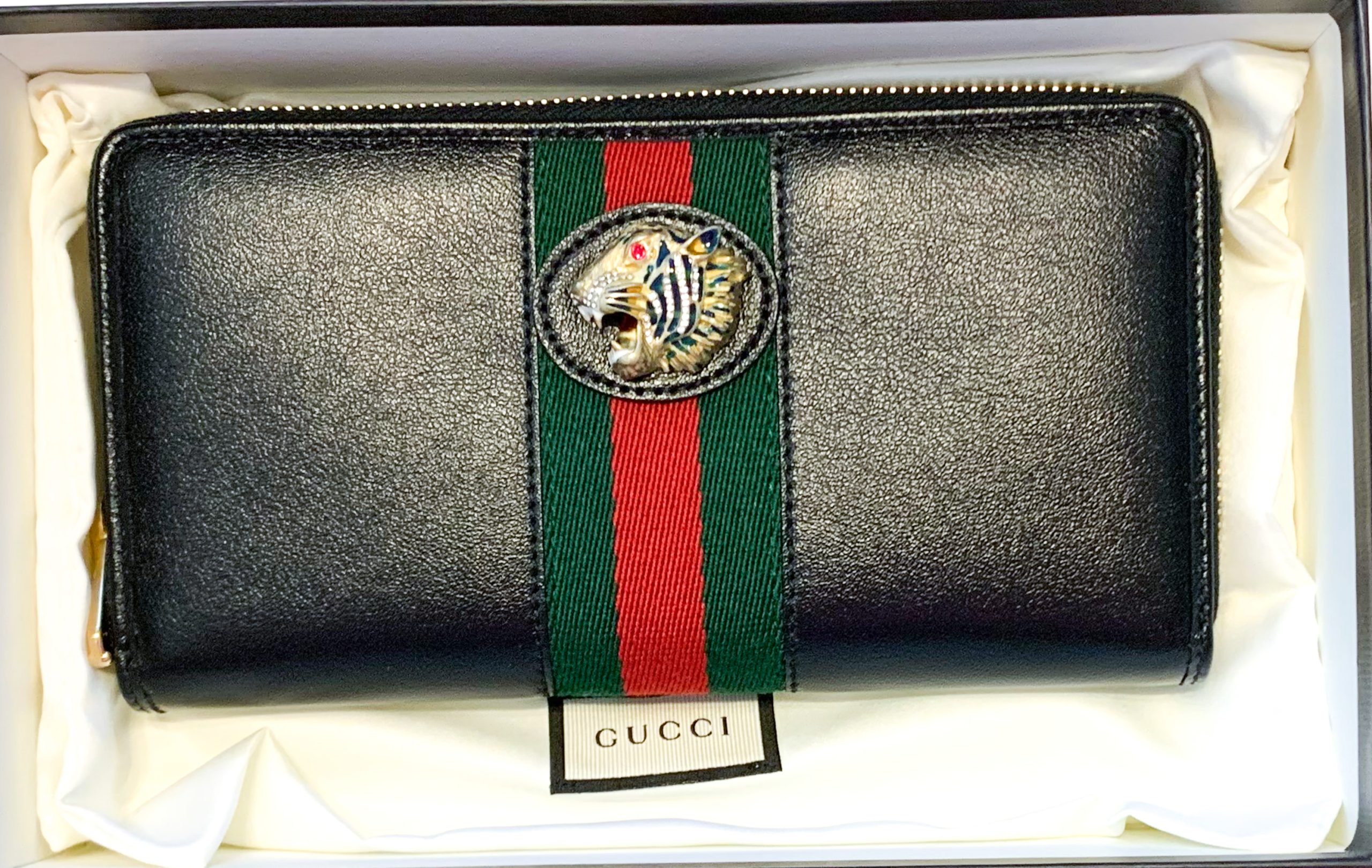 Gucci NIB Rajah GG Tiger Head Leather Web Stripe Zip Around Long Clutch Wallet