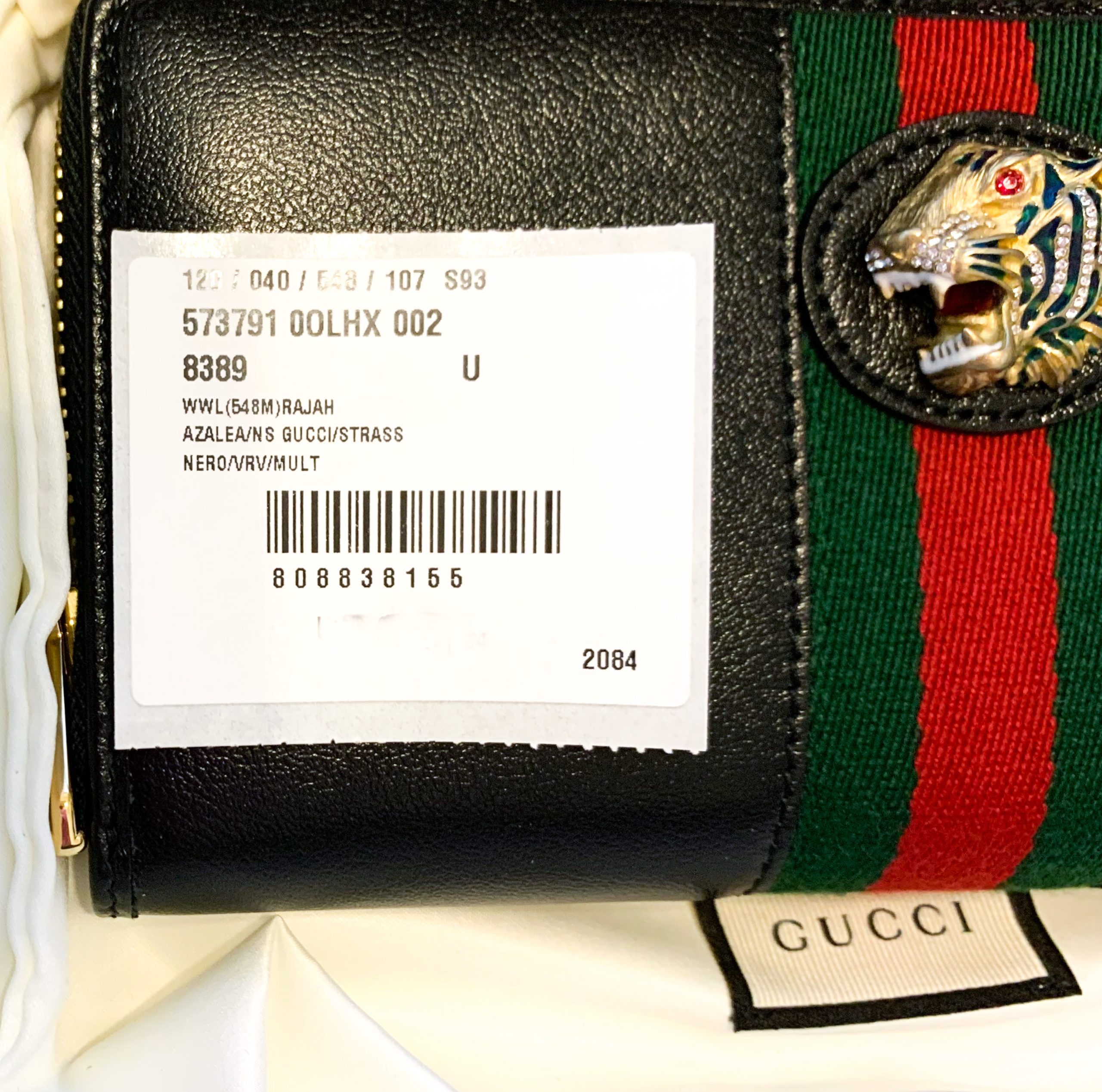 • Style: RAJAH BLACK LEATHER GG WEB STRIPE ZIP AROUND CLUTCH WALLET