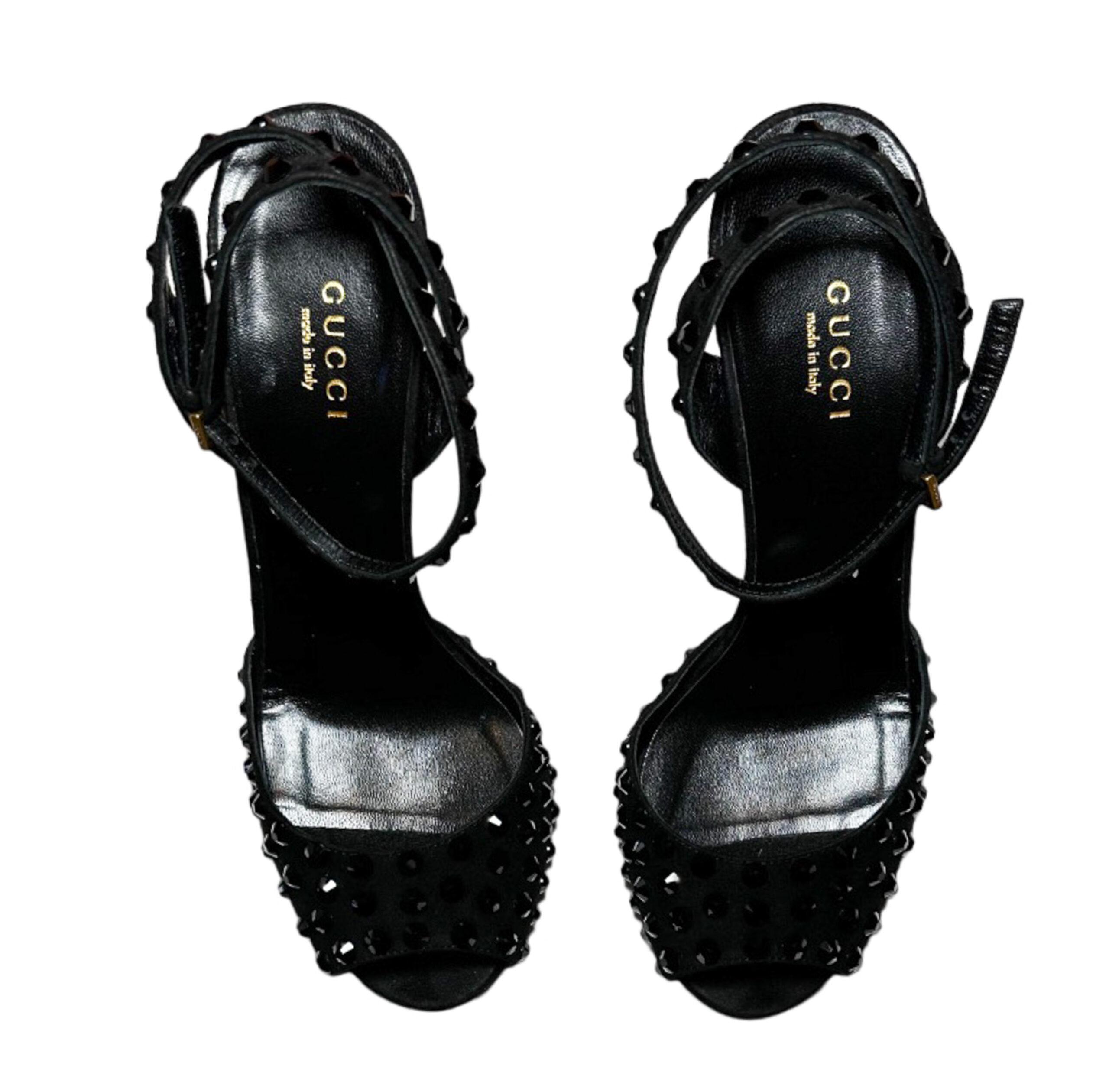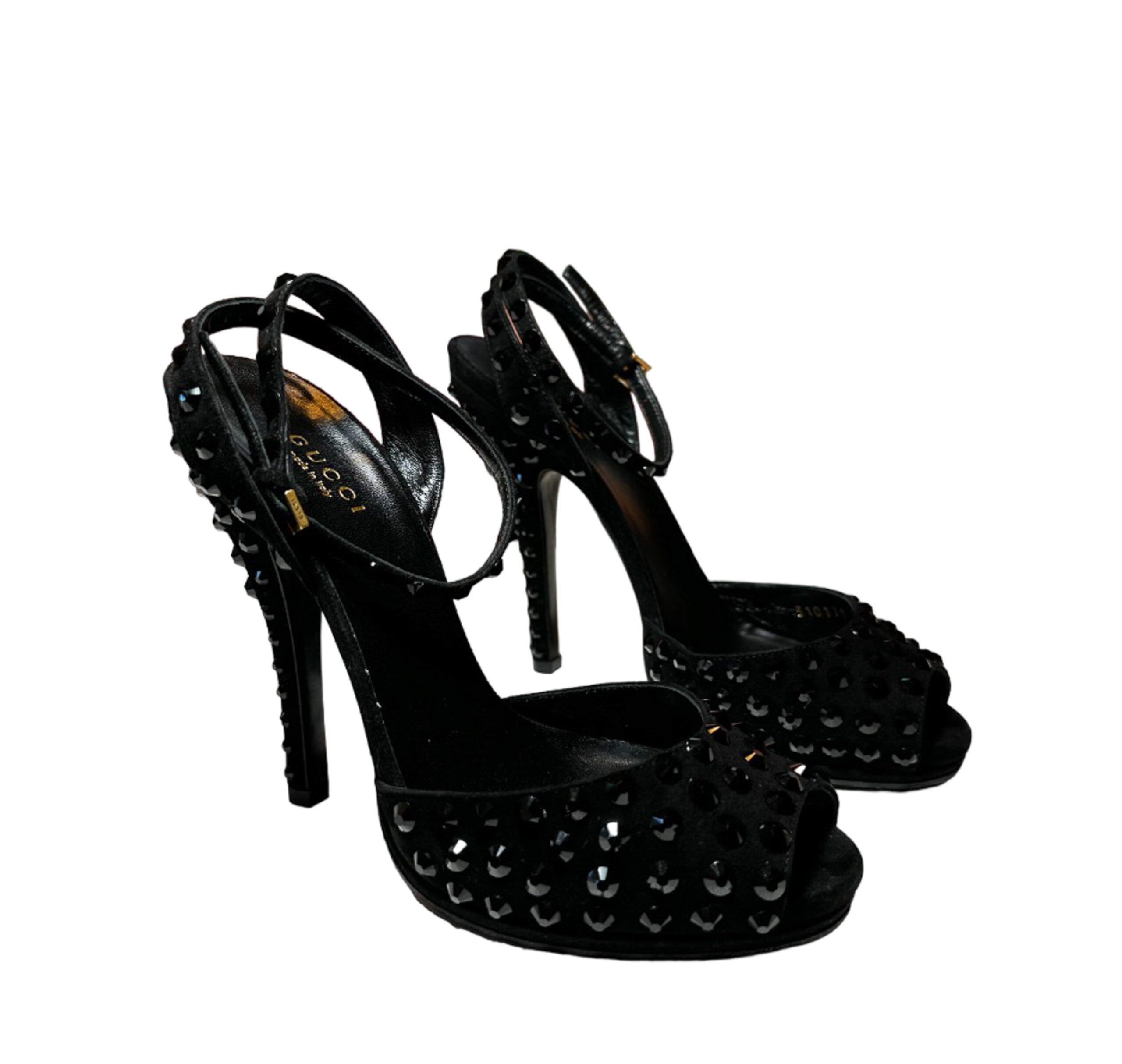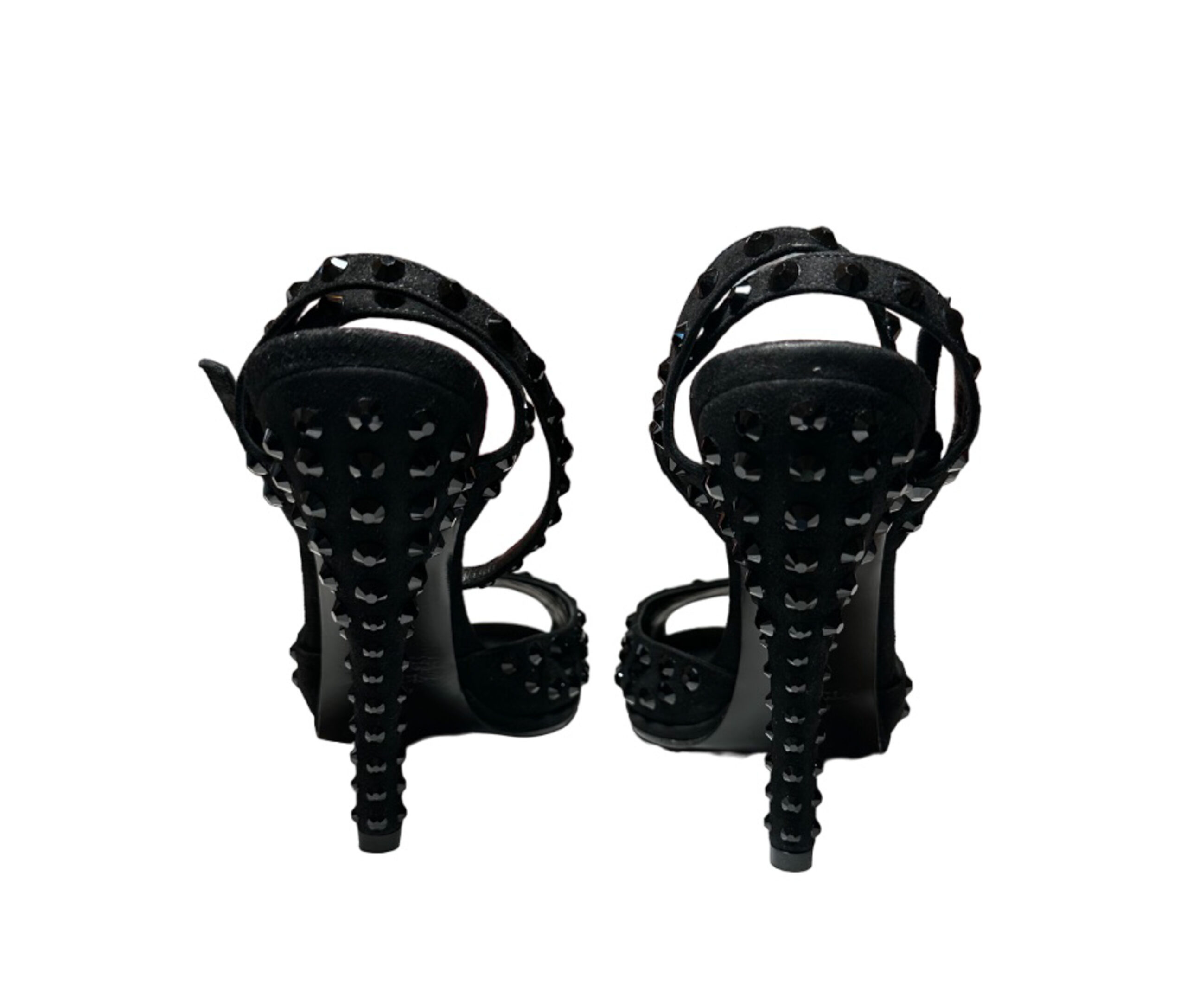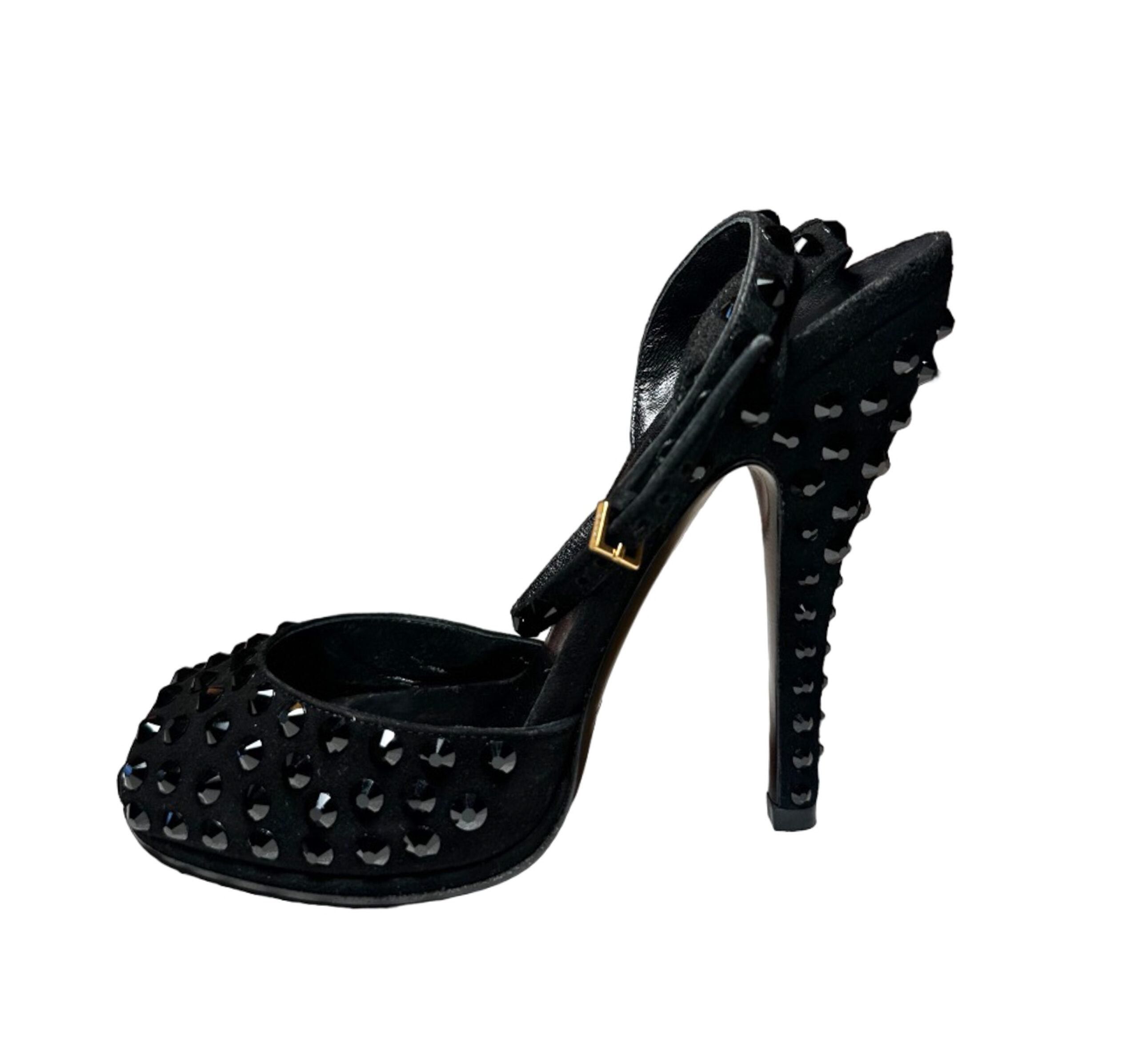- Style: Yulia Black Suede Crystal Embellished Peep Toe Sandals Heels