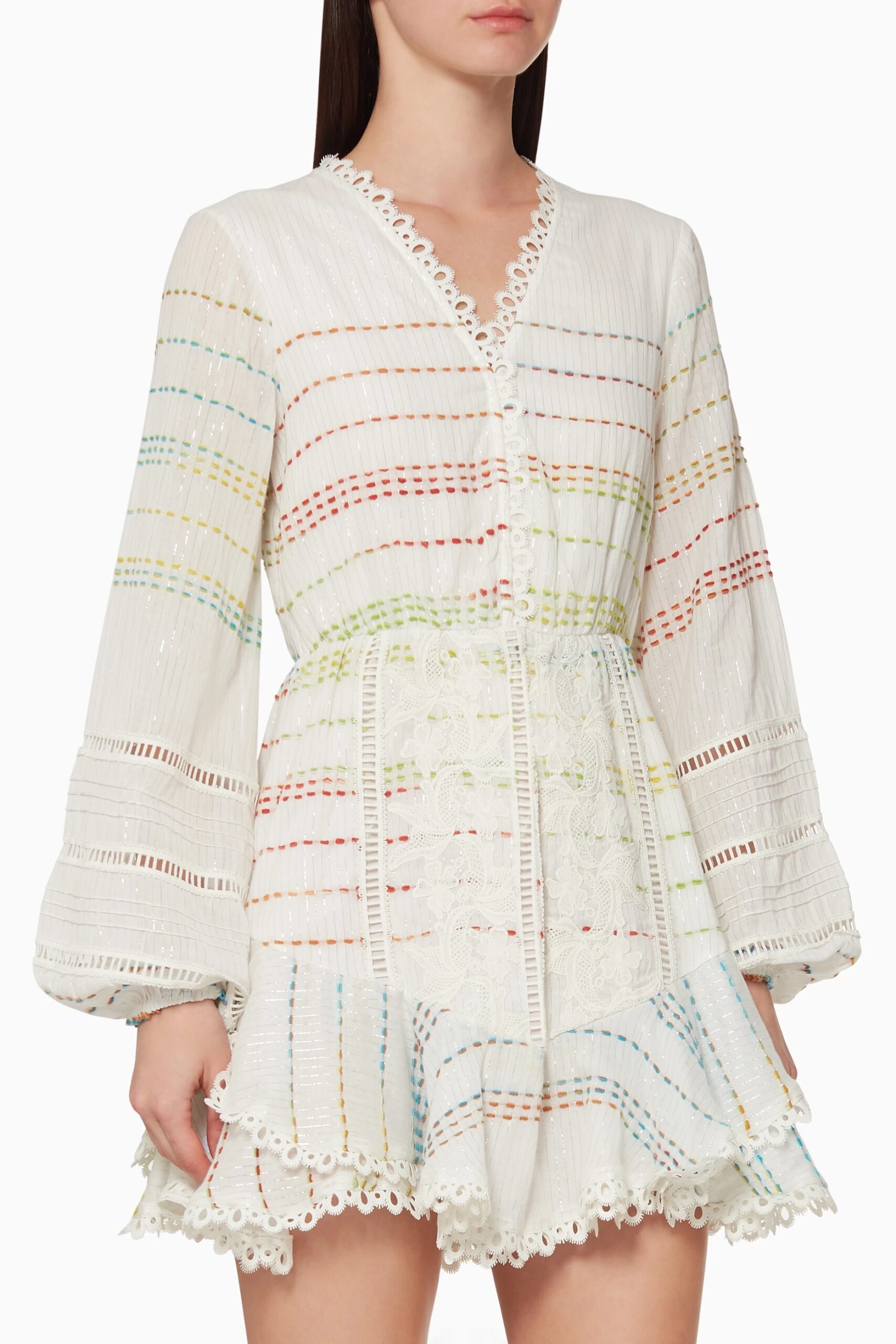 - Style: Thea White Gauze Lace V-Neck Long Sleeve Boho Mini Dress