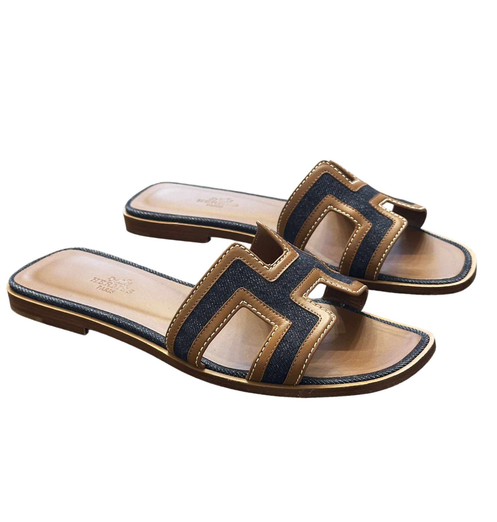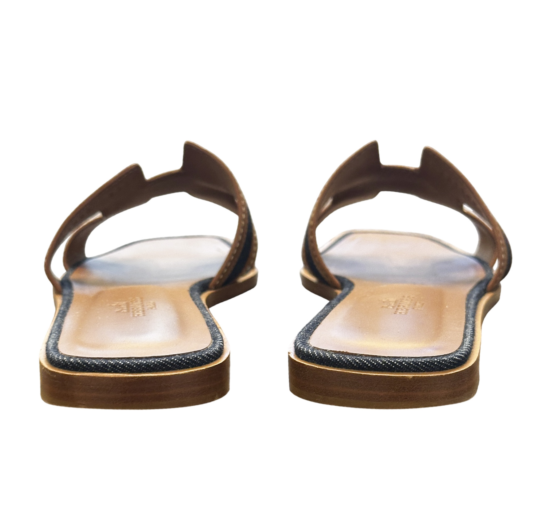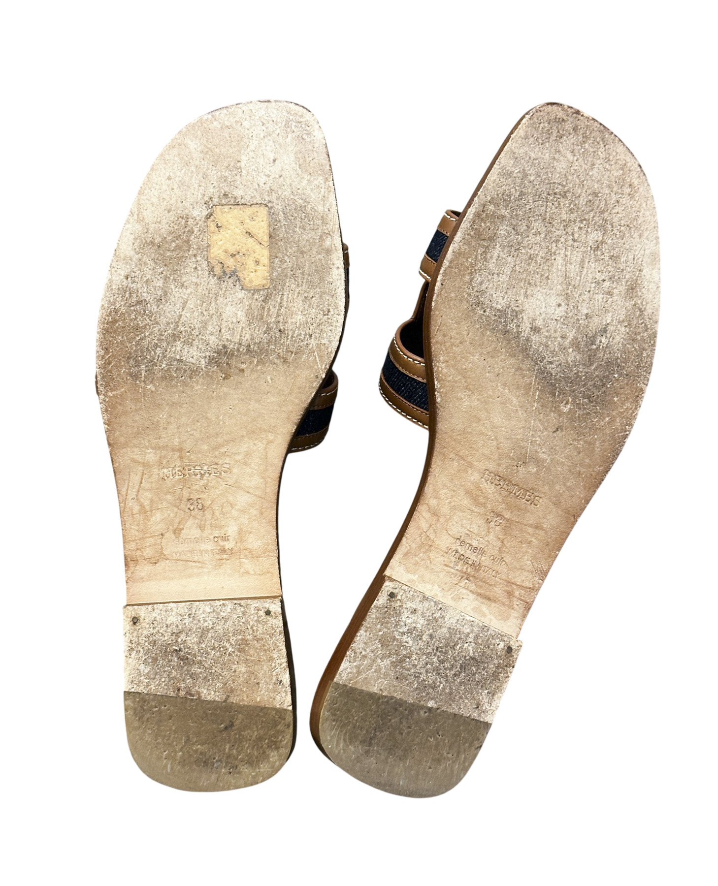 Hermès Oran Brown Gold Leather Blue Denim H Slides Flats Sandals Size 38