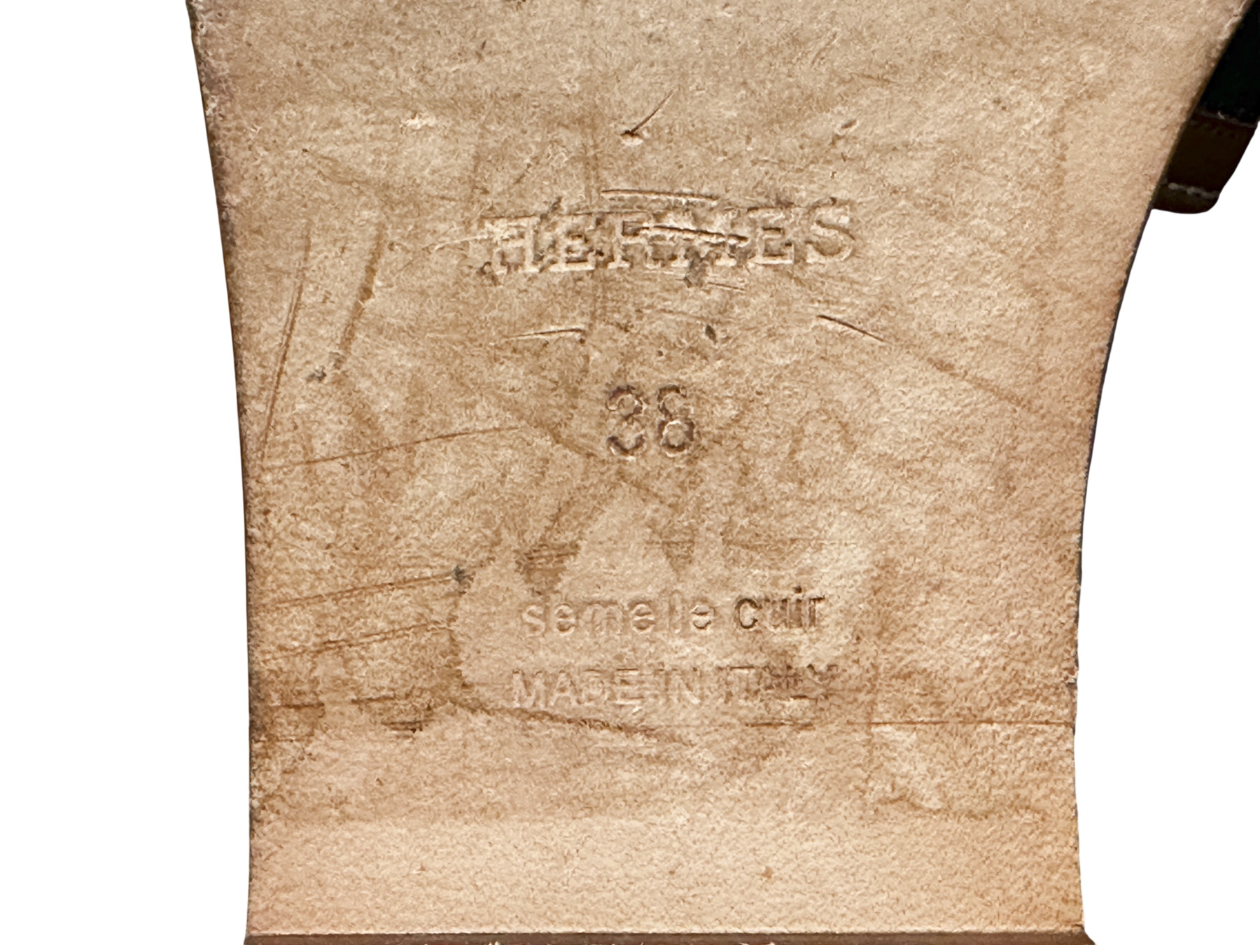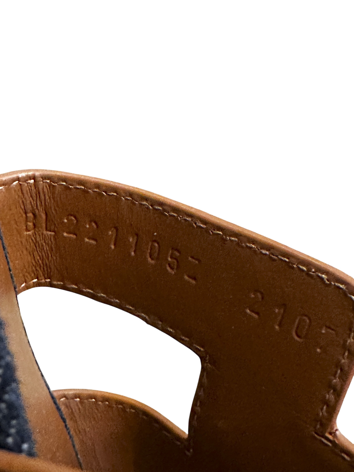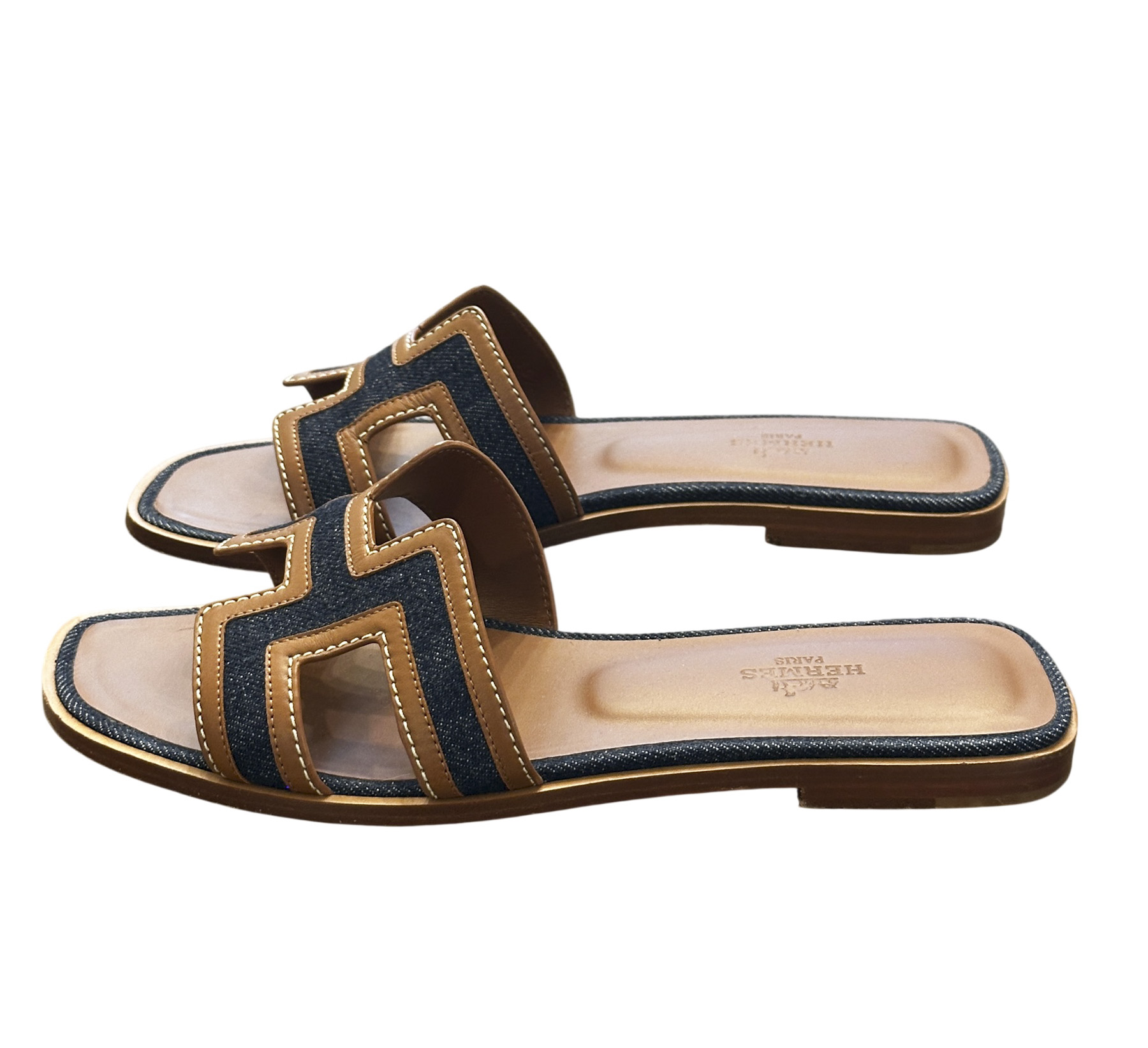 Hermès Oran Brown Gold Leather Blue Denim H Slides Flats Sandals Size 38