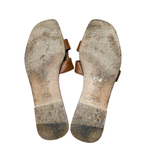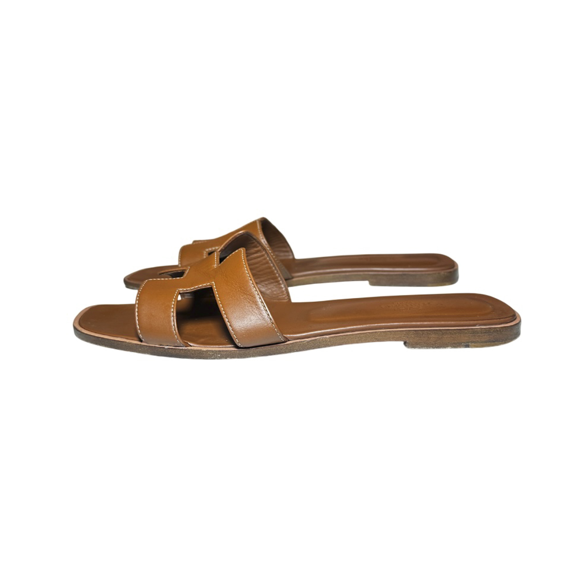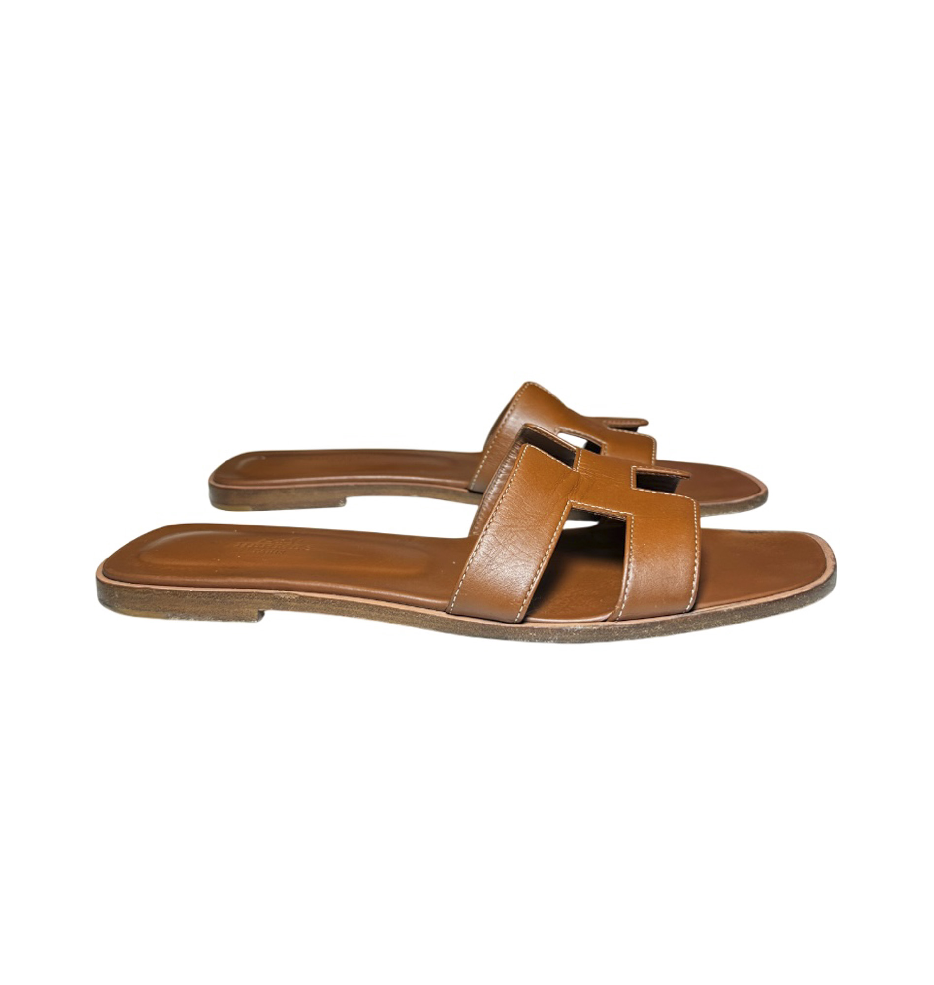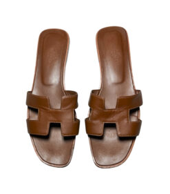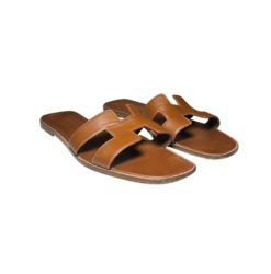 - Style: Oran Brown Gold Leather H Slides Flats Sandals