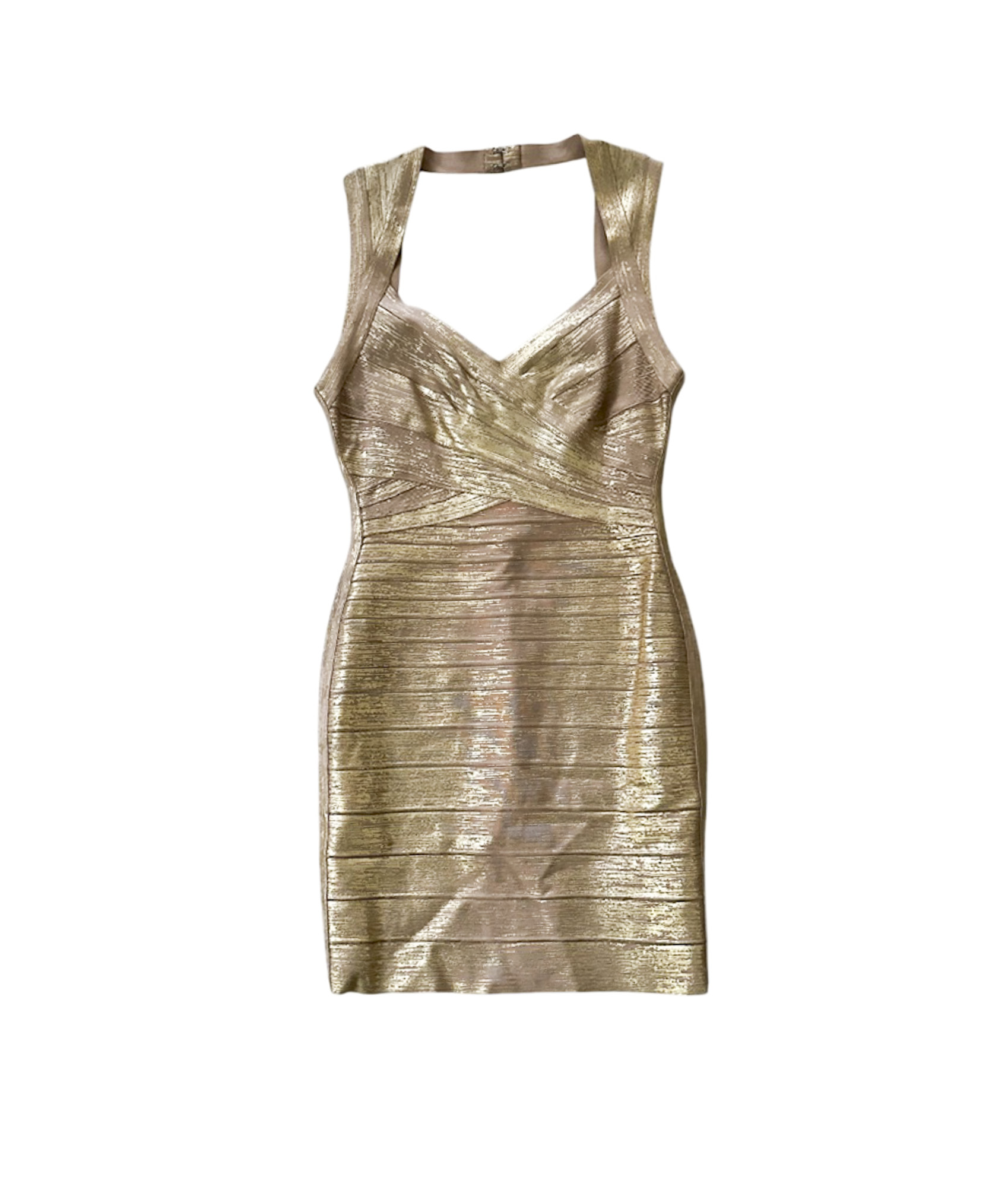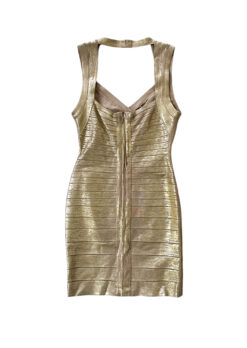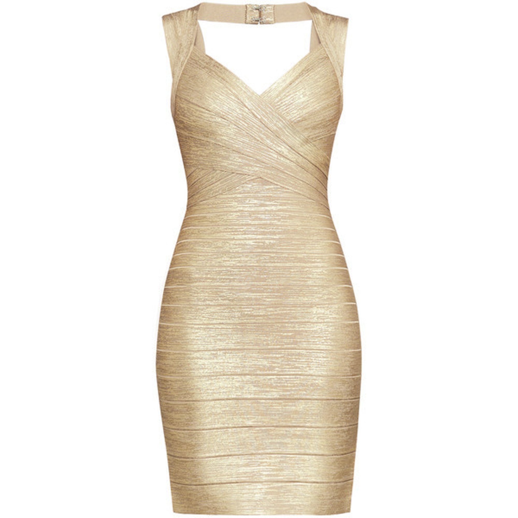 - Style: Iman Gold Foil V-Neck Bandage Bodycon Mini Dress