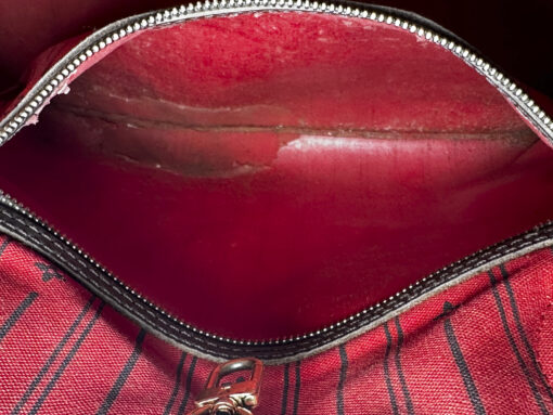 - Condition: Pre-Owned; Interior shows dirt/marks. Exterior is clean – there is wear to the leather handles. Interior pocket has some peeling (see photos)