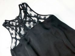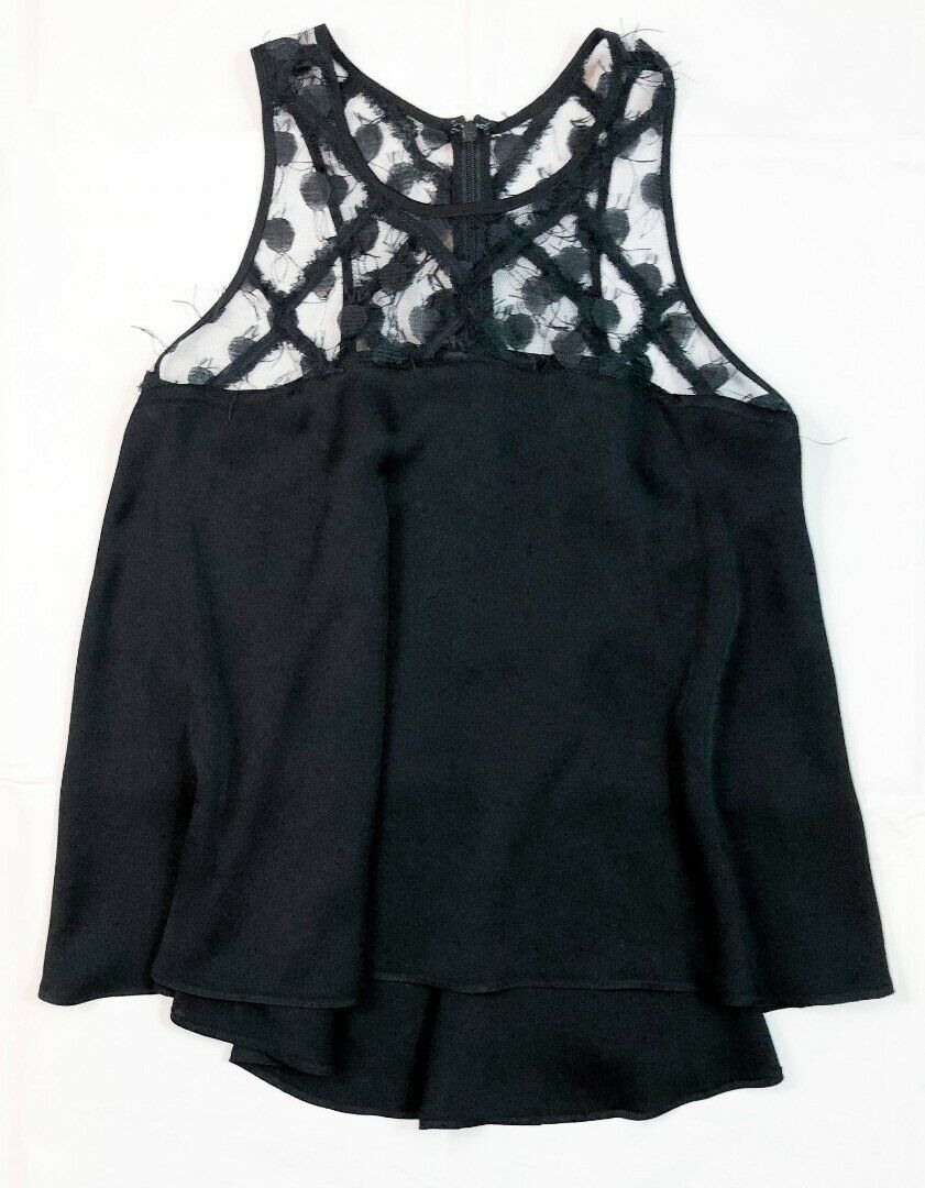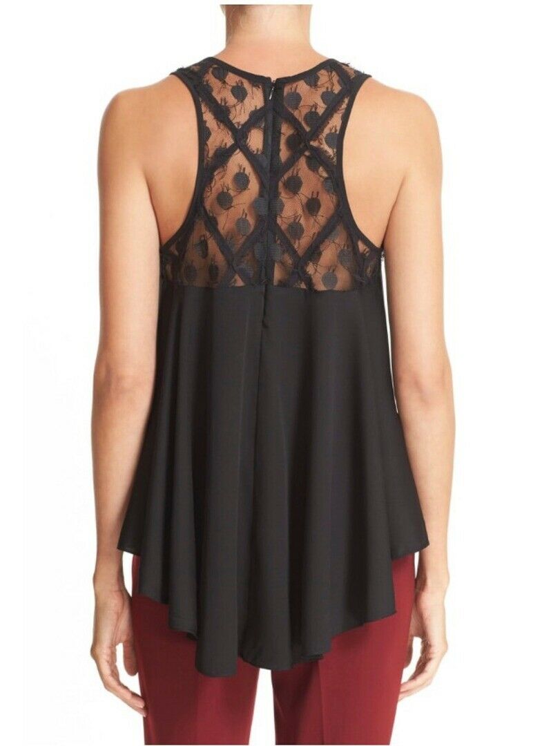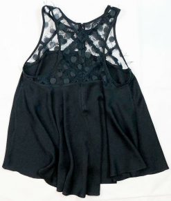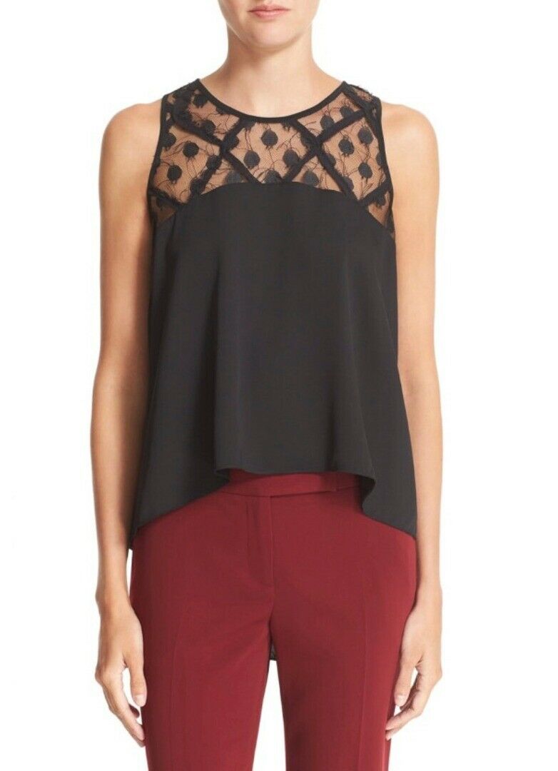 - Style: BLACK ILLUSION LACE STRETCH SILK TRAPEZE TOP