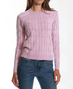 Minnie Rose Cotton Stone Wash Distressed Cable Knit Crew Neck Sweater XS Pink