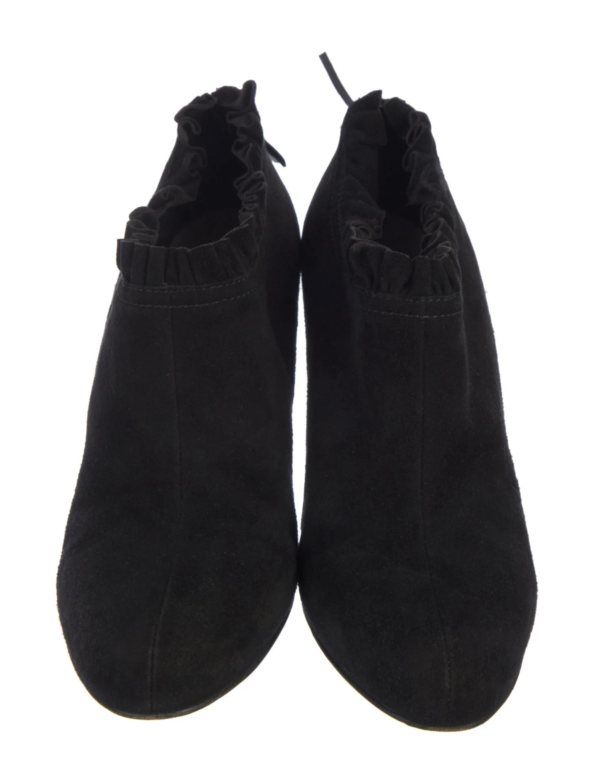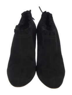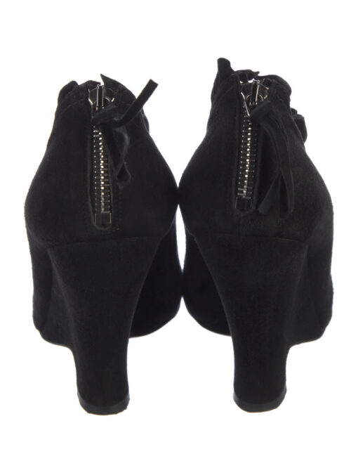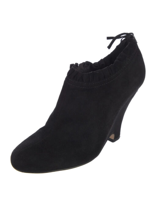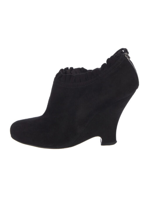 - Style: Black Suede Ruffle Trim Wedge Heels Ankle Boots