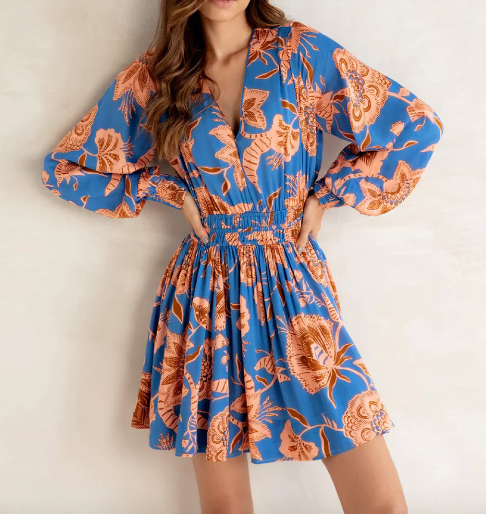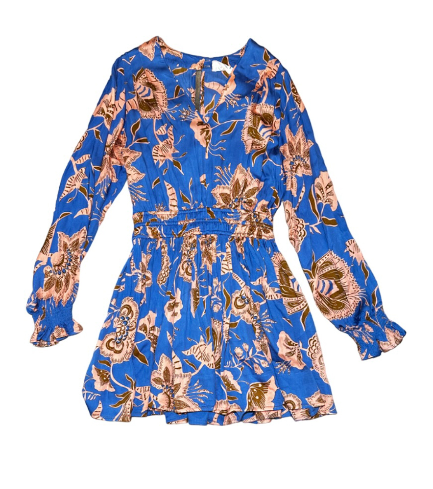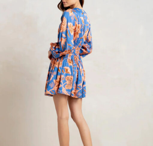 Omika Adele Floral Long Sleeve V-Neck Mini Dress Sitara Azure Small