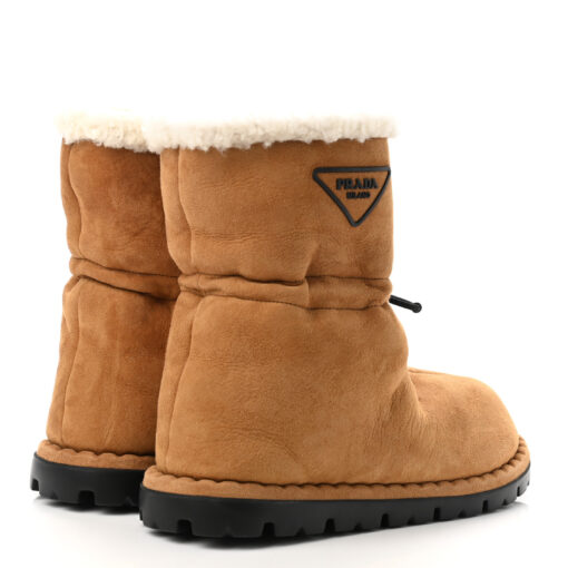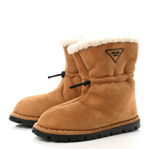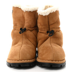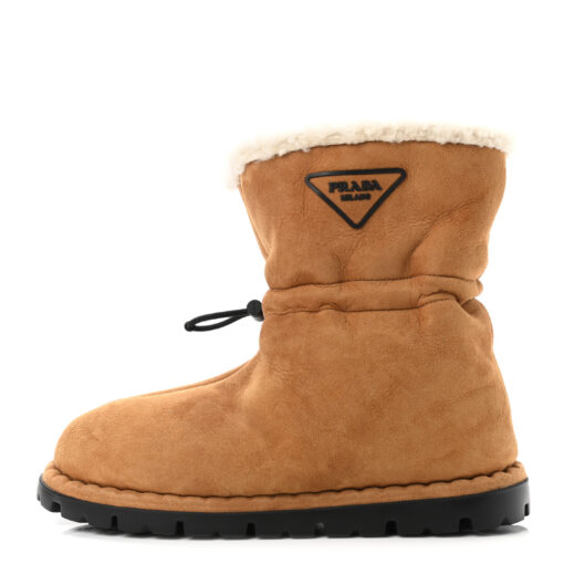 - Style: Suede Shearling Lined Triangle Logo Drawstring Ankle Boots