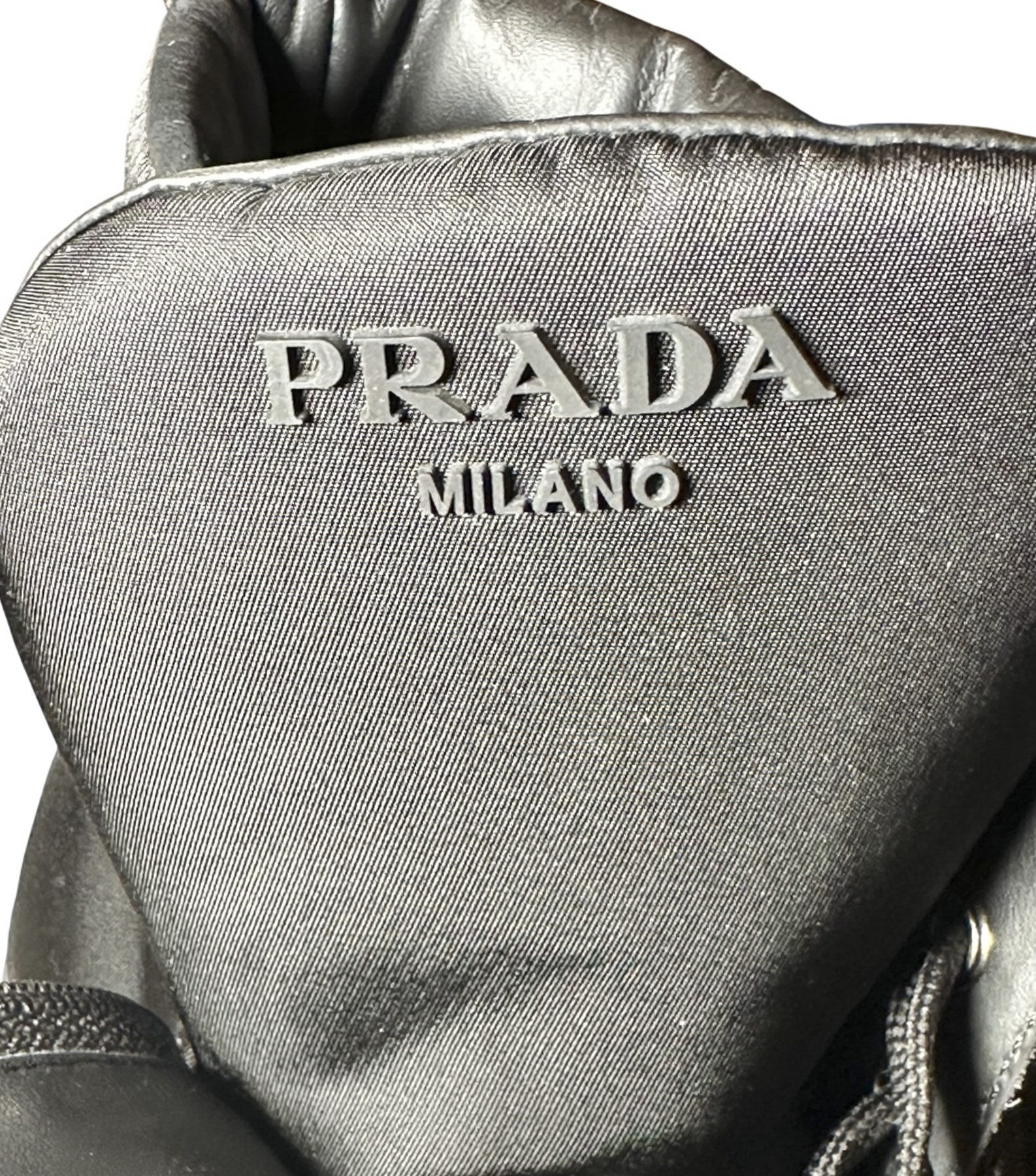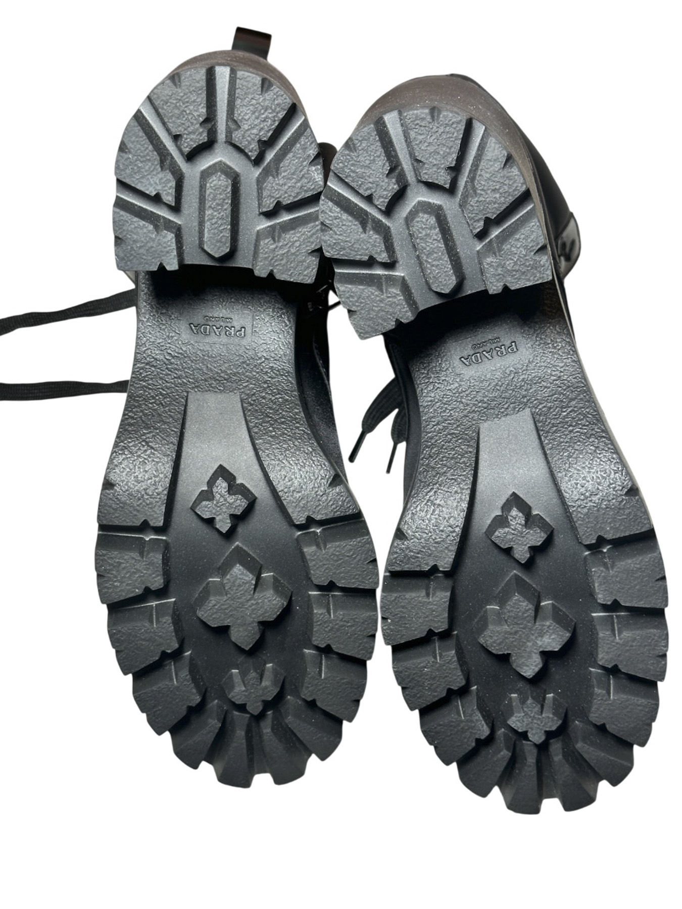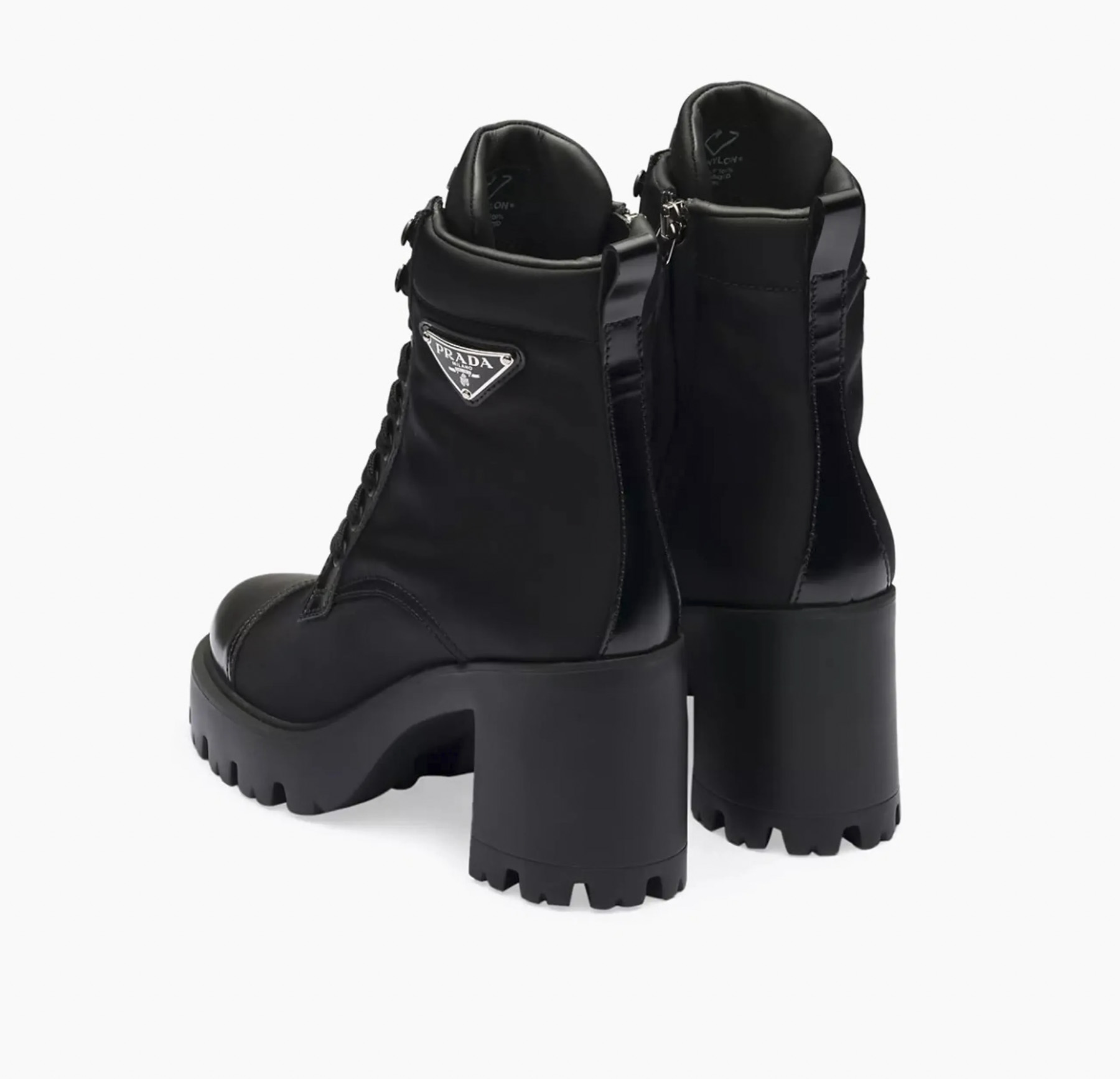 - Style: Re-Nylon Leather Metal Triangle Logo Lace Up Black Ankle Boots