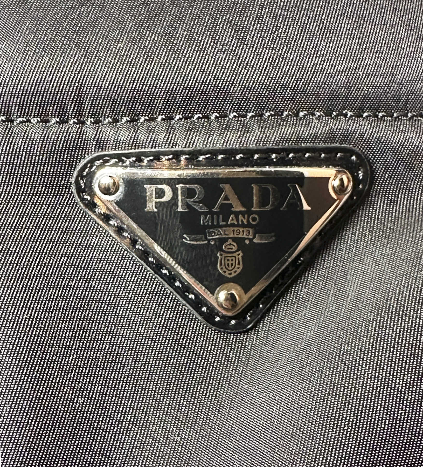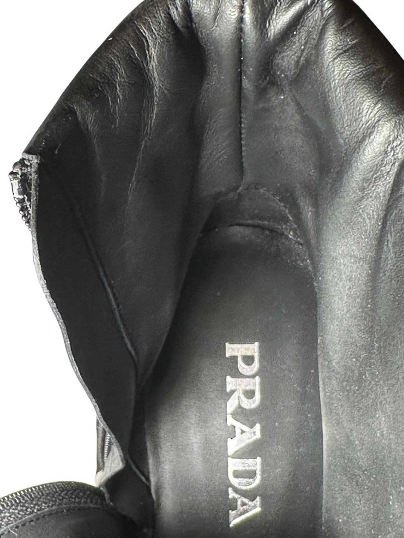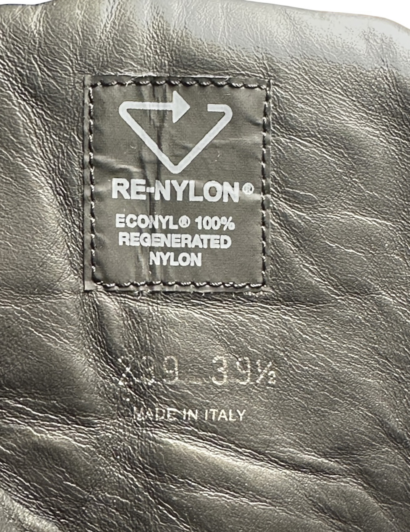 - Style: Re-Nylon Leather Metal Triangle Logo Lace Up Black Ankle Boots
