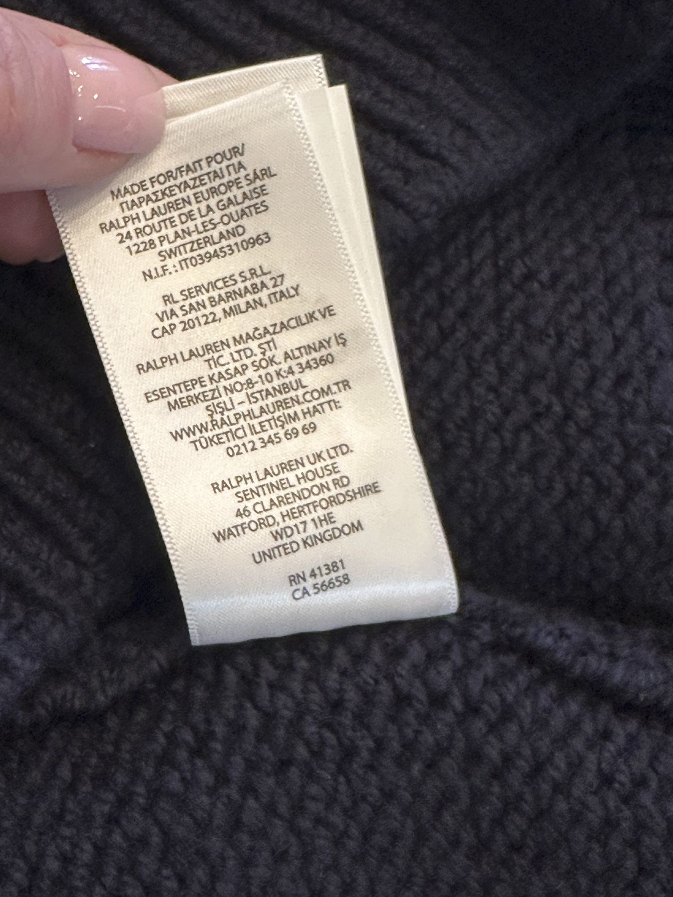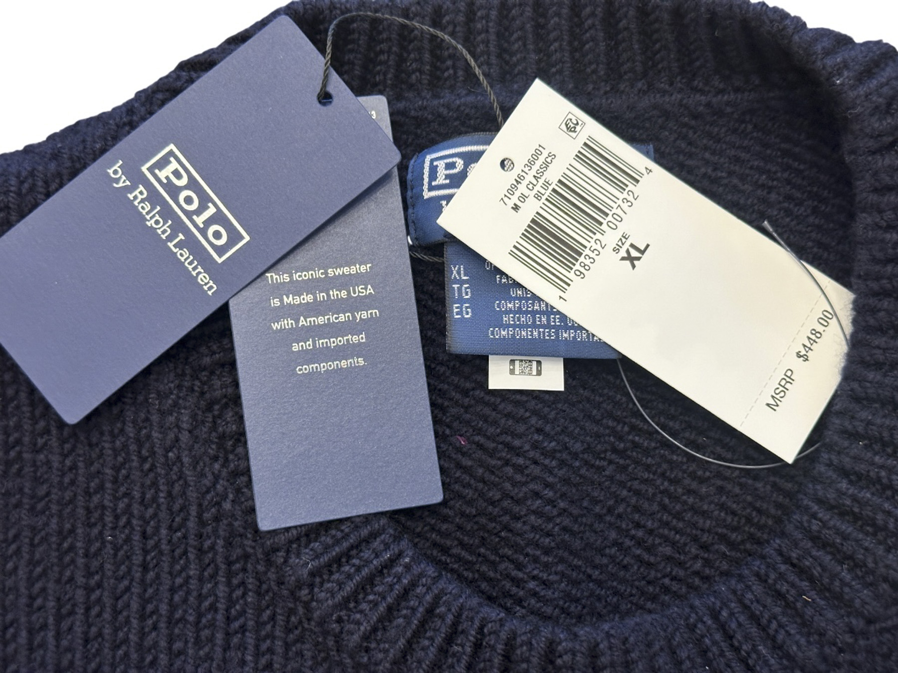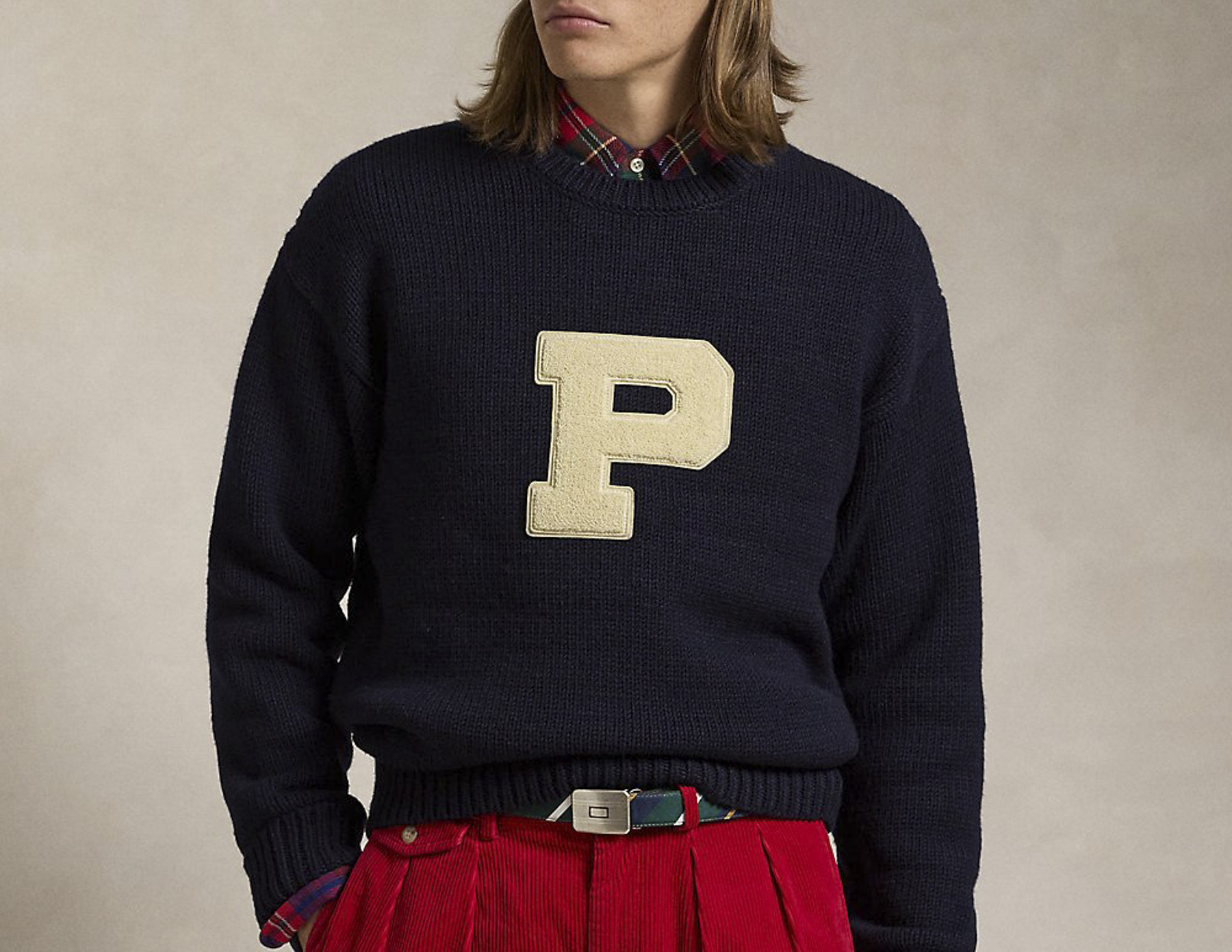- Style: Men’s Navy Wool Chunky Knit Letterman Sweater