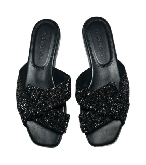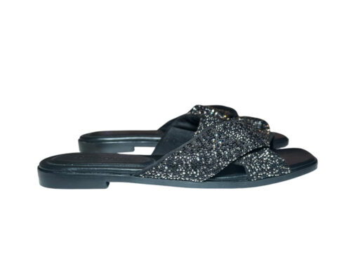 - Style: Alrai Black Crystal Embellished Knot Slip On Slides Sandals