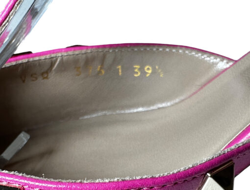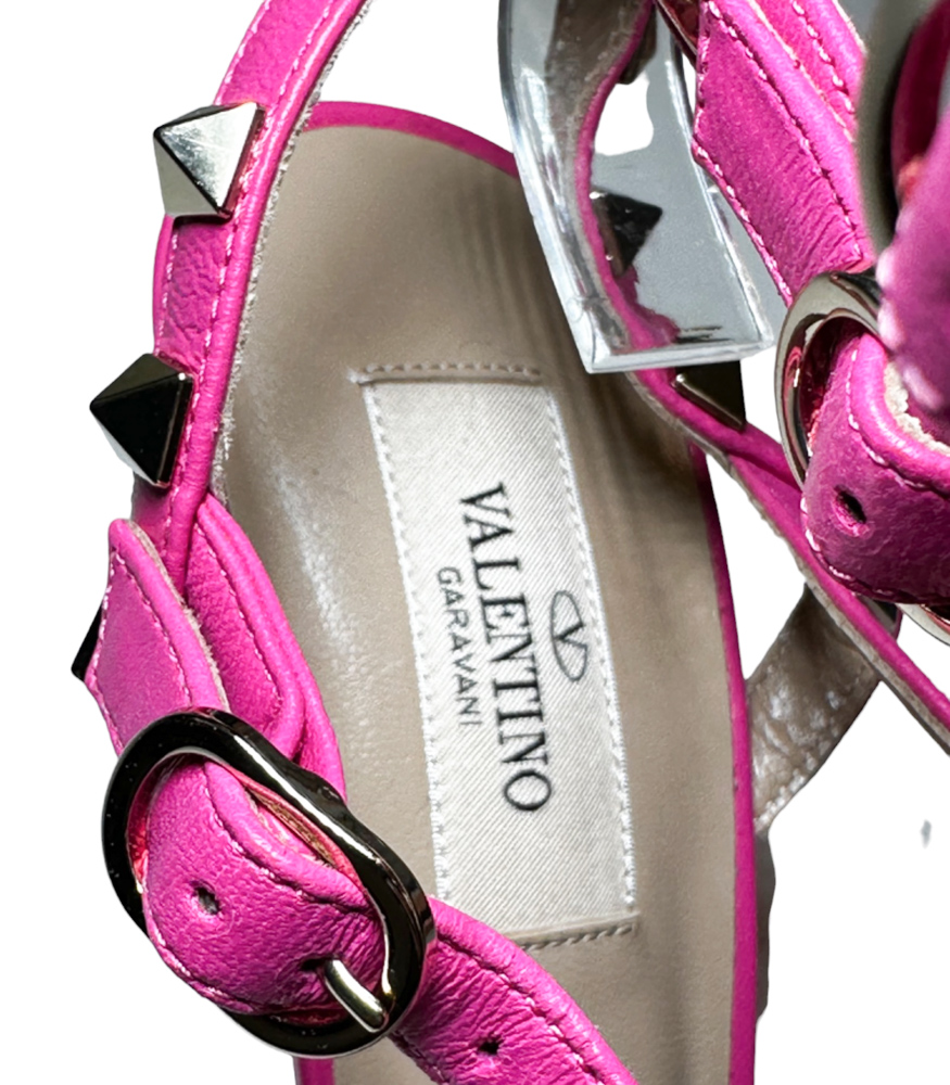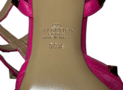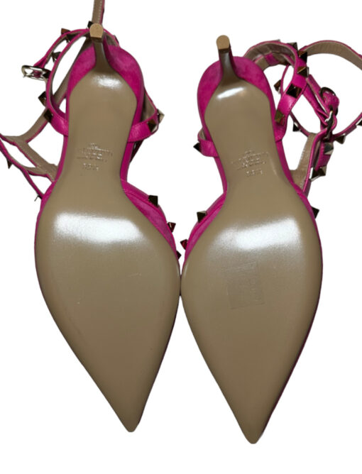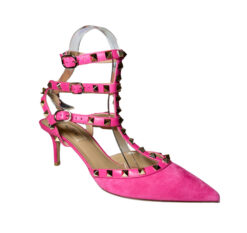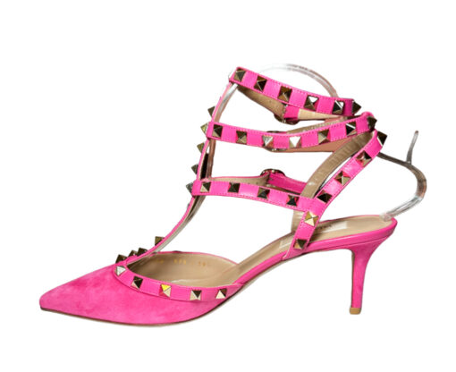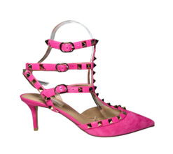 - Style: Rockstud 65 Pink Suede Caged Ankle Strap Pumps