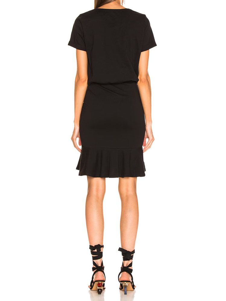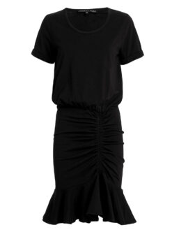 - Style: Pima Ruched Short Sleeve Crew Neck Flounce Mini Dress